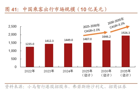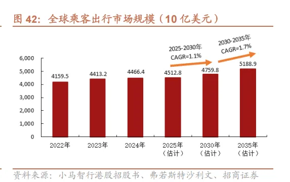 乘客出行市场整体维持平稳运行的态势,中国市场增速突出,在全球中的占比也将稳步提升。从乘客出行市场来看,随着中国消费需求与城市化的推动,2022-2035 年间中国将成为全球乘客出行市场的核心增长极,规模占比稳步提升。根据世界汽车工业国际协会等机构数据,2022 年中国乘客出行市场规模为12,350亿美元,全球总规模达41,595亿美元;预计2035年中国规模将增至19,243 亿美元,全球总规模达51,889 亿美元。其中,中国市场增速表现尤为突出:2022-2024 年复合年增8.3%,大幅领先全球(3.6%)及世界其他地区(1.6%);后续2025-2030 年、2030-2035 年增速仍保持2.1%、3.2%,持续高于全球及世界其他地区水平,成为带动全球乘客出行市场扩容的关键引擎。