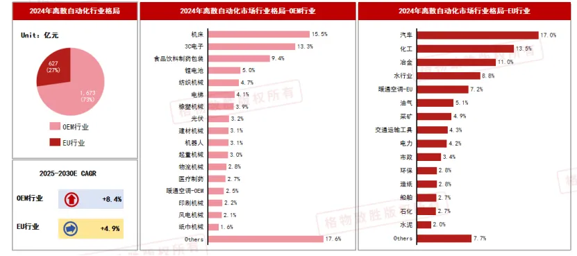 2024年离散自动化OEM行业占比超70%,市场份额在73%,其中机床、3C电子、食品饮料制药包装设备占比较大,EU行业占比27%,汽车、化工和冶金在EU行业占比排名前三。