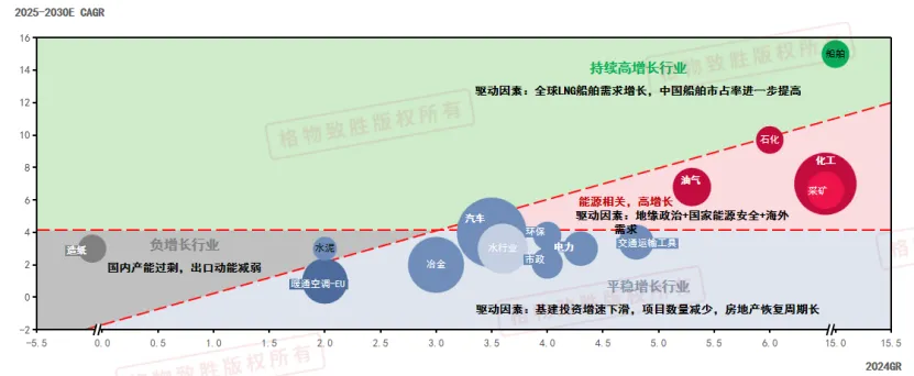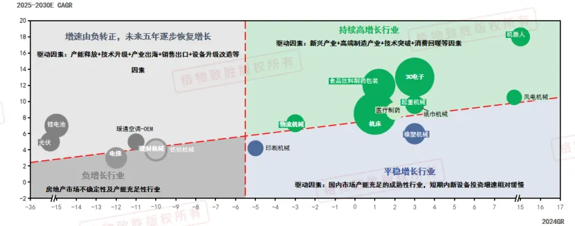 未来五年持续高增长行业建议重点关注工业机器人,半导体制造,增材制造,新能源汽车柔性产线,3C电子,机床,食品饮料包装制药的出海,物流起重等场景。