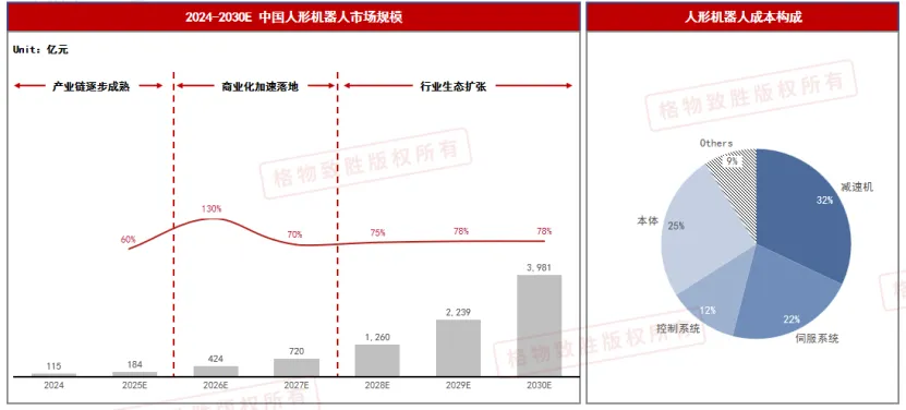 2024-2025产业链逐步成熟:市场需求逐步释放,技术不断突破,技术溢价逐步消退,传统工业机器人企业加速入局,推动技术快速迭代与成本优化。