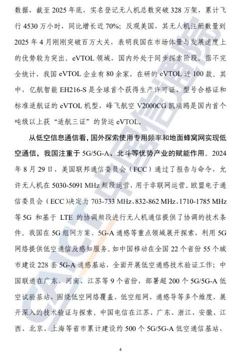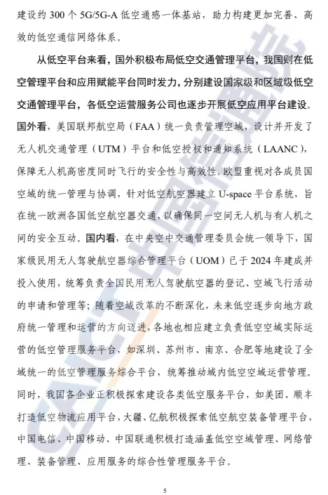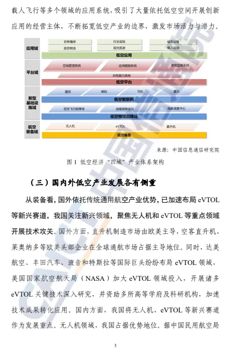 近日,中国信息通信研究院(简称“中国信通院”)正式发布《低空产业高质量发展路径与策略研究报告(2025年)》。报告聚焦低空产业发展,界定低空经济内涵与“四域”产业体系,对比国内外发展差异,梳理我国低空装备、智联网等细分领域现状、趋势与路径,明确 2027-2035 年三阶段发展目标,剖析产业四大核心挑战,从五大维度提出发展建议,为低空产业高质量发展提供系统性指引。低空经济以新型应用场景为牵引,以低空基础设施和低空装备等共性产业为支撑,协同保障新型经济形态的安全健康发展,带动产业深度融合与协同发展。低空产业“四域”是低空经济发展的物理载体,包括航空装备域、新型基础设施域、平台域和应用域。低空应用逐步向低空城市适飞空域拓展、常态化高密度飞行转变、载人载物混飞跃迁,低空应用商业闭环成为探索重点。农林植保和行业巡检应用是第一发展梯队,应用水平较为成熟,处于从单机向网联规模化发展的阶段;城市管理、物流运输、旅游观光等应用是第二发展梯队,已涌现部分成功应用案例,但尚处于探索期,具有较强的发展基础和潜力,是低空应用下一阶段的发展方向;载人空中交通是第三梯队,该类场景目前产业与政策仍在规划和起步阶段,装备还处于研发期、安全等问题尚未解决,但未来具有较大发展潜力,成为低空未来布局发展的重点。此外,全国各地在既有产业基础、地形地貌限制、经济创新能力等方面各有不同,应充分结合地域优势,构建区域应用发展集群,形成特色发展格局。低空产业发展整体呈现“由单机视距到规模网联、由单一载物到载人载物混飞”的态势,将按照“局部试点-区域商用-规模发展”逐步递进。低空产业发展分为三大阶段,到2027年为局部试点阶段,预计市场规模达到5000亿元。到2030年是区域商用阶段,预计市场规模攀升至1万亿元。到2035年为规模发展阶段,预计市场规模有望达到5万亿元。低空产业应以顶层规划、试点示范、管控建设、技术创新、生态构建为重点方向,支撑我国低空经济的高质量创新发展。一是强化顶层设计,形成跨领域合作;二是树立示范标杆,建立应用牵引的推广体系;三是健全空域管控体系,构建安全防护能力;四是以试验区为基,打造技术创新体系;五是加强供需对接,完善产业生态环境。