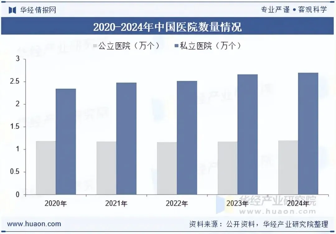 目前,1.5T及3.0T超导MRI为临床应用的主流机型。国产MRI行业发展推动了产业链的自主可控及产品价格下降,2023年起,国家卫健委取消对1.5T及以上MRI的配置管理,1.5T及3.0T超导MRI均出现下沉普及的发展趋势。其中,3.0TMRI原主要由大型三级甲等医院与科研机构采购,近几年已开始下沉到其他三级医院;1.5TMRI成本较低,在三级医院和二级医院使用较为广泛,并逐渐向基层医疗机构普及。近年来我国医院数量呈增长态势,2024年公立医院数量为1.2万家,私立医院数量为2.7万家。