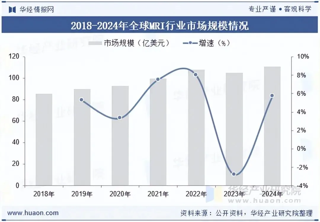 全球MRI行业市场近年来持续增长,市场规模已由2018年的85.5亿美元增长至2024年的111亿美元,年复合增长率为4.45%。