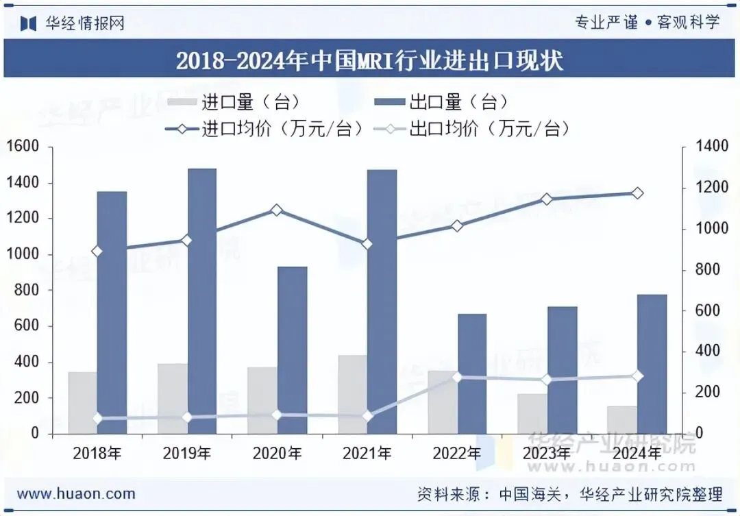 中国市场的MRI产业起步较晚,前期一直被进口产品垄断。在国家鼓励减少高端医疗设备进口依赖的大背景下,国家陆续出台一系列政策支持医疗器械国产化发展,近年来我国MRI进口量整体呈下降态势,2024年我国MRI进口量为159台,进口均价为1177.9万元/台,出口量为782台,出口均价为281.3万元/台。