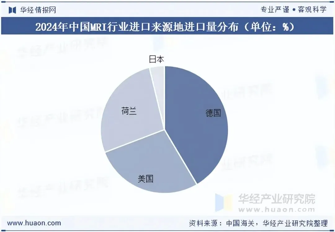 我国主要从德国、美国、荷兰与日本四个国家进口MRI,2024年进口量分别为66台、44台、43台与6台,分别占比41.51%、27.67%、27.04%与3.77%。