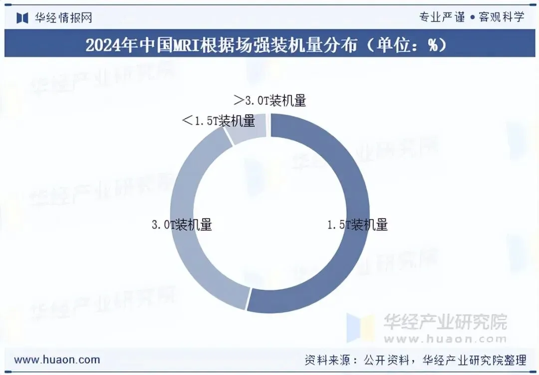 从设备主磁体类型来看,超导MRI是国内市场的主流机型,2024年全年装机总量占比超过90%。从场强分布来看,以新装机量计,1.5T和3.0T的MRI设备是最主要的机型,分别占2024年国内市场全年装机总量的53.9%和38.3%。