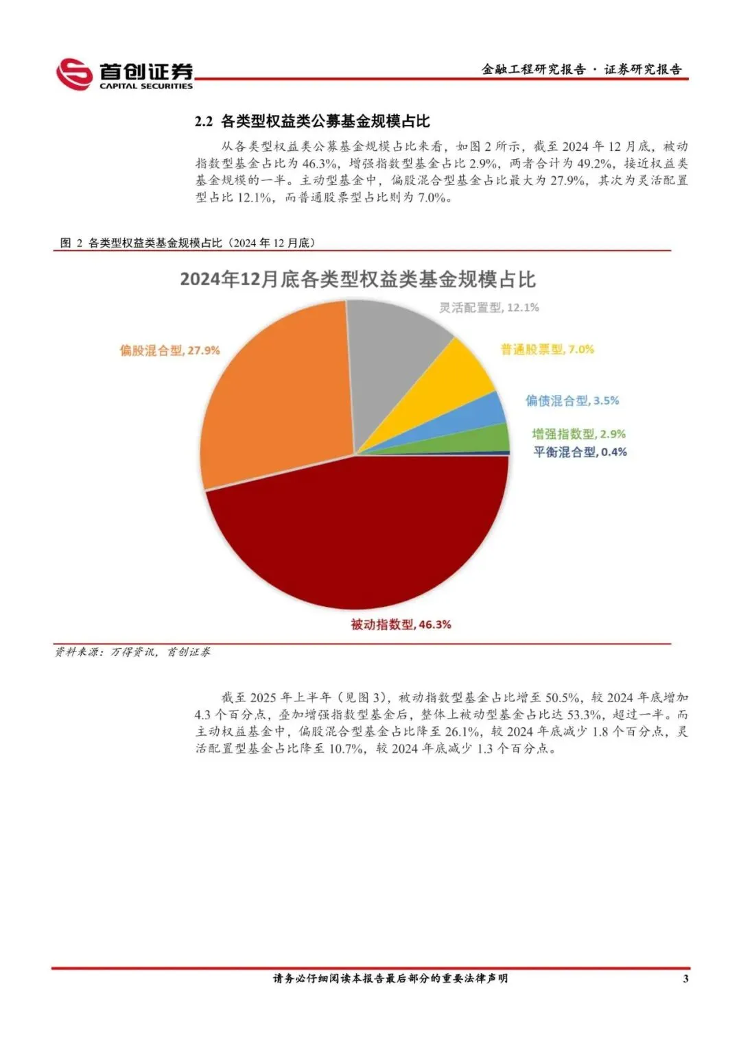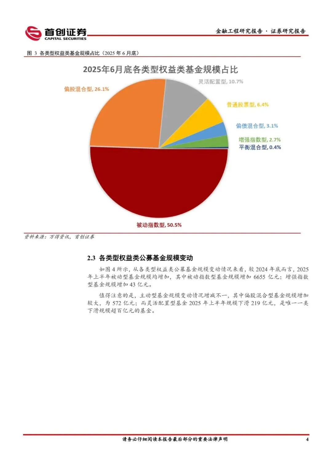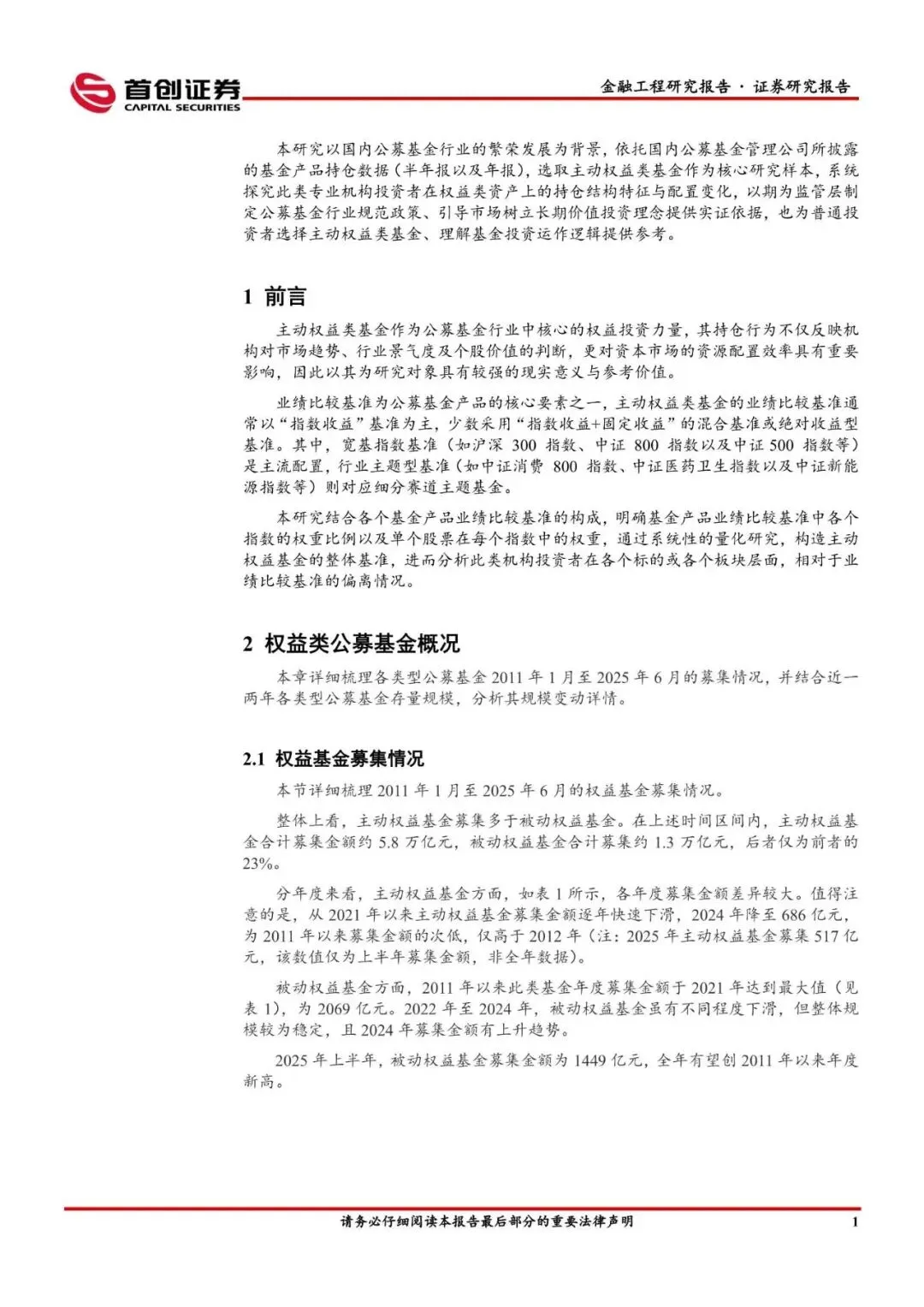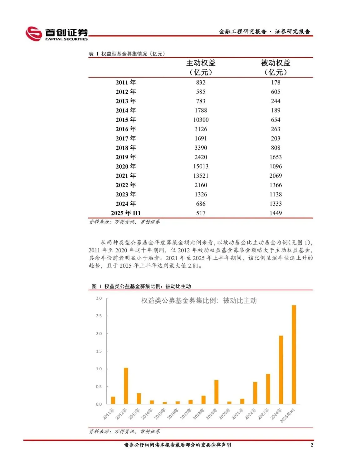 长期看主动权益基金募集多于被动权益基金:2011 年 1 月至 2025 年 6月,主动权益基金合计募集金额约 5.8 万亿元,被动权益基金合计募集约 1.3 万亿元,后者仅为前者的 23%。但从 2024 年开始,后者的年度募集金额已超过前者。