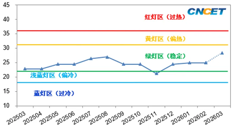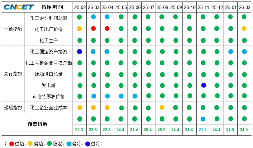 2月份化工行业综合预警指数保持在绿灯区运行,终值为24.9点,与1月份持平。在构成综合预警指数的9个分指数中,化工出厂价格由绿灯区进入黄灯区运行,化工固定资产投资保持至浅蓝灯区运行,化工企业利润总额、化工生产、化工亏损企业亏损总额、原油进口总量、发电量、布伦特原油价格和化工企业营业成本均保持在绿灯区运行。具体显示见图3。