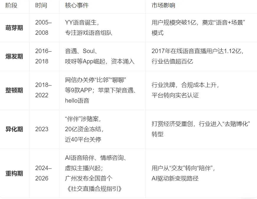 技术基础成熟:2008年后,VoIP协议与WebRTC实时传输技术普及,使低延迟、高稳定性的语音通信成为可能,为语音社交平台提供底层支撑。
