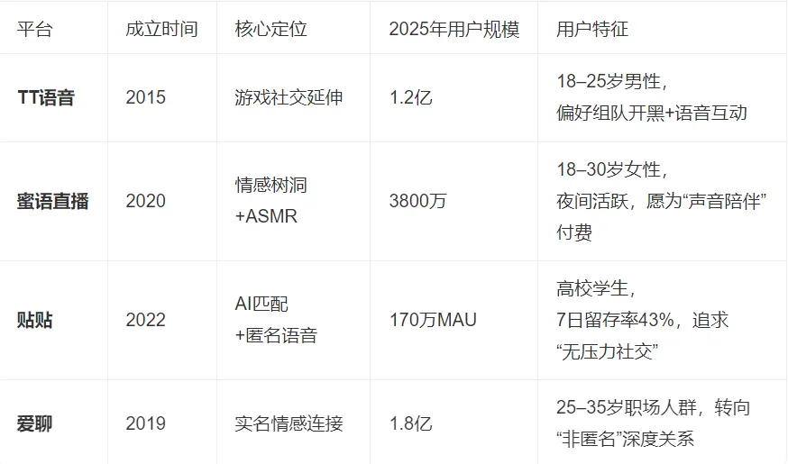 行业转型与替代路径:2020年后,爱聊APP以AI匹配+真人认证实现1.8亿用户增长,语音社交从“匿名交友”转向“实名情感连接”。