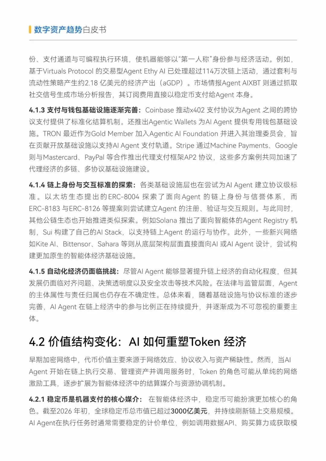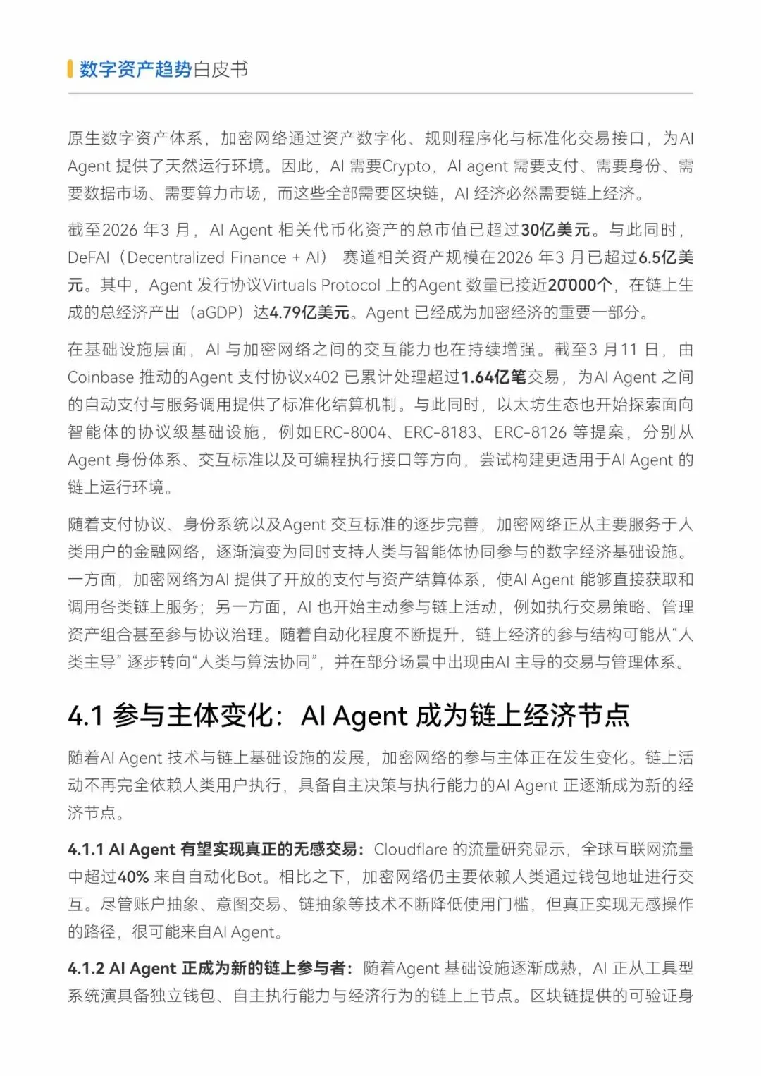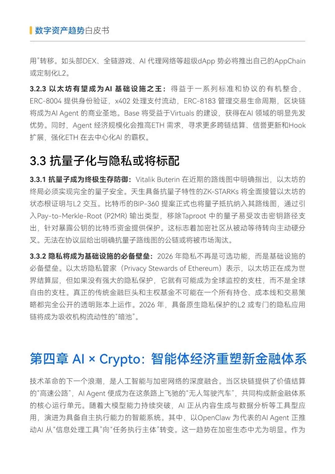报告着重指出,在2026年的时候,有两大趋势正在对数字资产体系进行重塑,其一,AI Agent变成了链上经济的全新主体,它拥有自主钱包、支付能力以及交易执行功能,促使交易从“人机交互”朝着“意图驱动”转变,并且催生出智能体经济;其二,真实世界资产也就是RWA加速上链,美债、大宗商品、股票等传统资产的代币化规模已经超过3400亿美元,成为链上稳定收益十分重要的来源。就在这个时候,技术方面zkEVM的大规模运用,模块化区块链成为主流,L2从“胖协议”变为“胖应用”,还有抗量子以及隐私保护的标配化,一同构建起了新金融体系的技术基础。