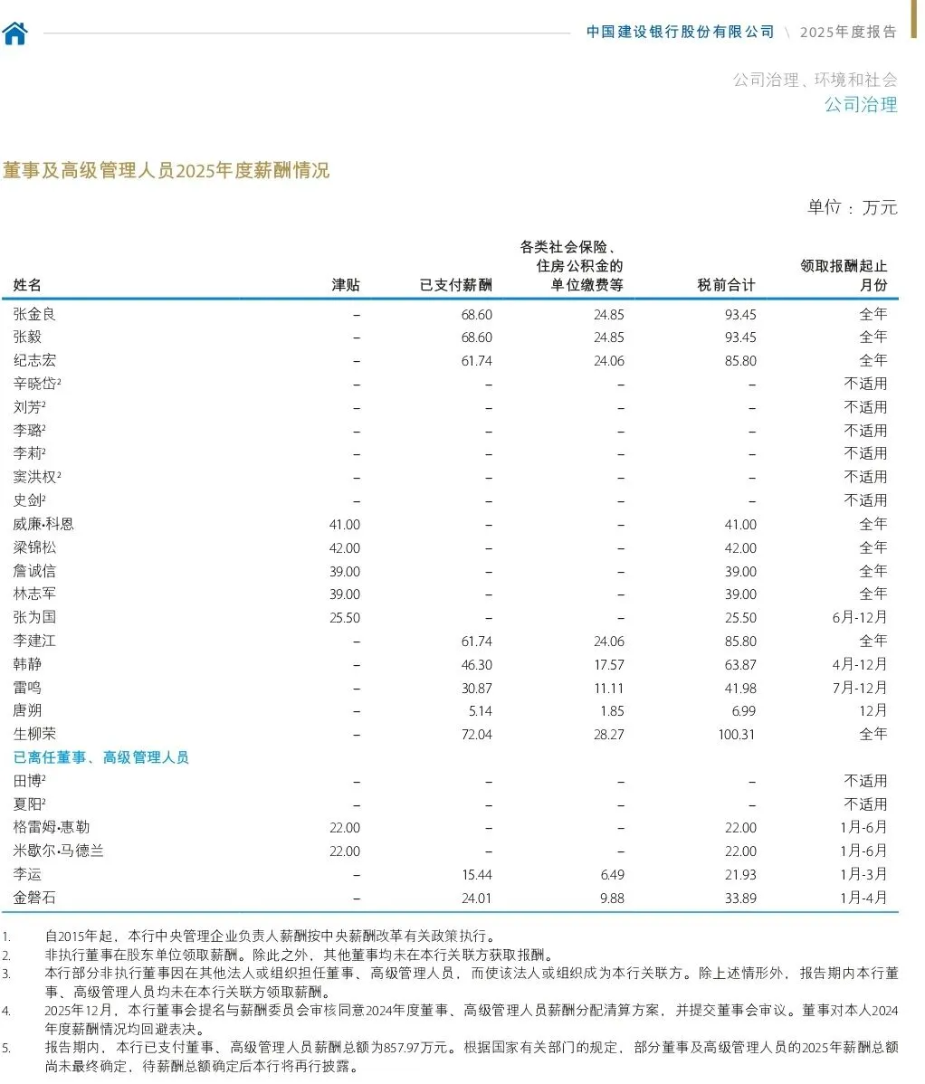 下图是建设银行的高管薪酬。