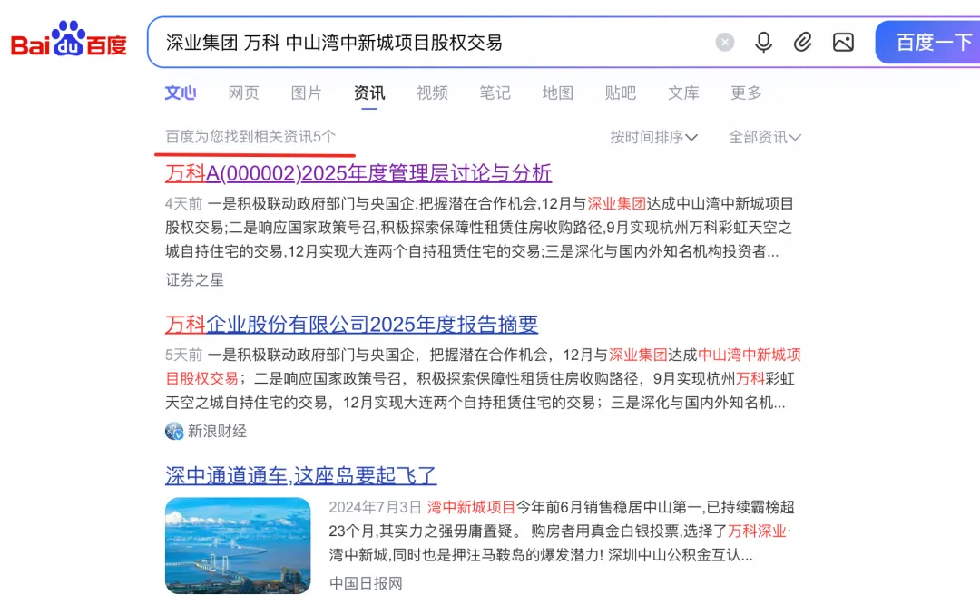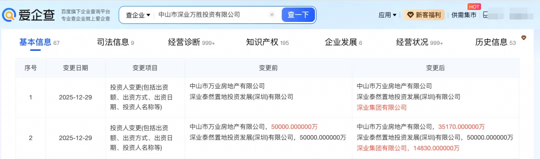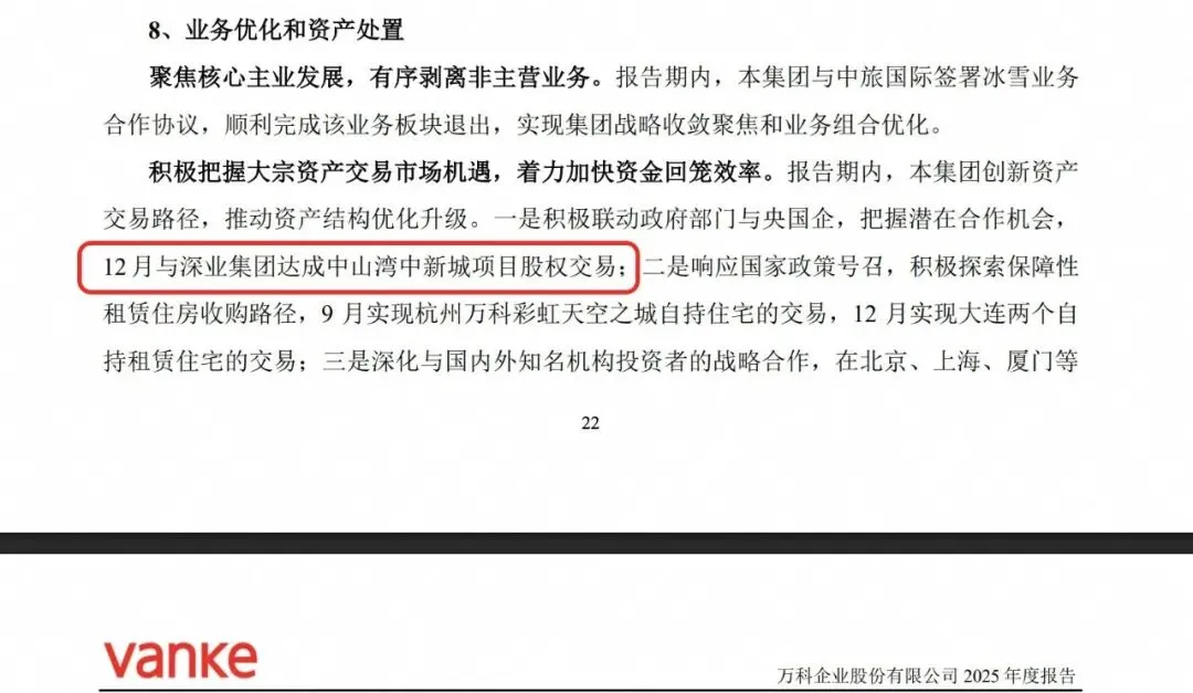 详细阅读万科2025年财报的时候,关注到如下的一句话,一是积极联动政府部门与央国企,把握潜在合作机会,12月与深业集团达成中山湾中新城项目股权交易。但这一条信息在万科的公告以及新闻信息中鲜有报道。以“深业集团+万科+中山湾中新城项目股权交易”作为关键词,百度也仅仅只有5条资讯,其中2条来源于万科财报以及一条来自于更早的信息。原来中山湾中新城项目的对应的公司—中山市深业万胜投资有限公司,中山市万业房地产有限公司的占比从50%下降至35.17%,新进入的公司深业集团有限公司(国有独资)持股14.83%。万科对应的应收款也发生了调整,从2024年底的 20.96亿,降低至14.81亿。看到这一幕,我真的感觉深圳国资委真的在使出吃奶的劲在救万科。毕竟上述股权交易是在2025年12月29日完成,极限逼近年关,总得留2~3天时间给大家更新财务账单。