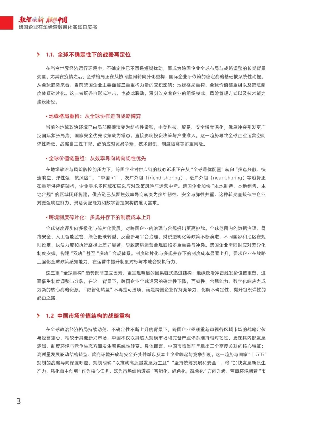 跨国跨国企业在华经营正经历数智化深刻变革。地缘政治重构、全球价值链调整及跨境制度碎片化,迫使企业重构能力体系。中国市场以超大规模体量、完整产业生态及领先数智环境,成为跨国企业全球战略关键锚点。