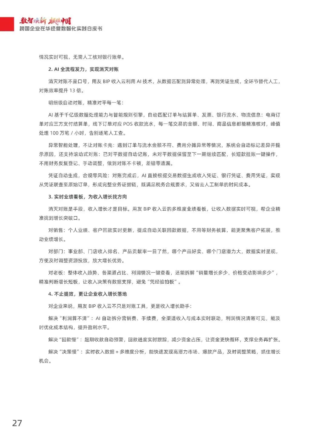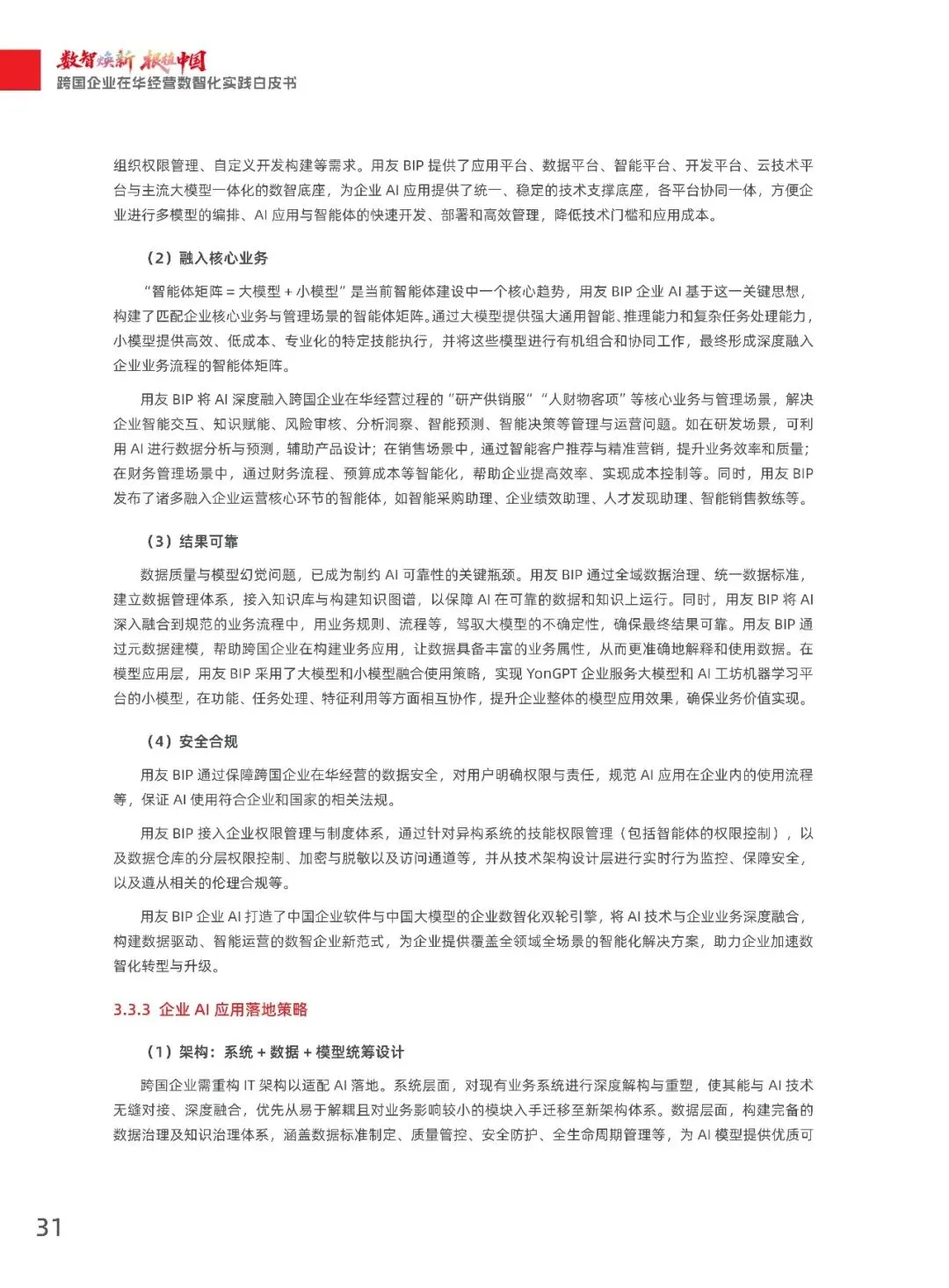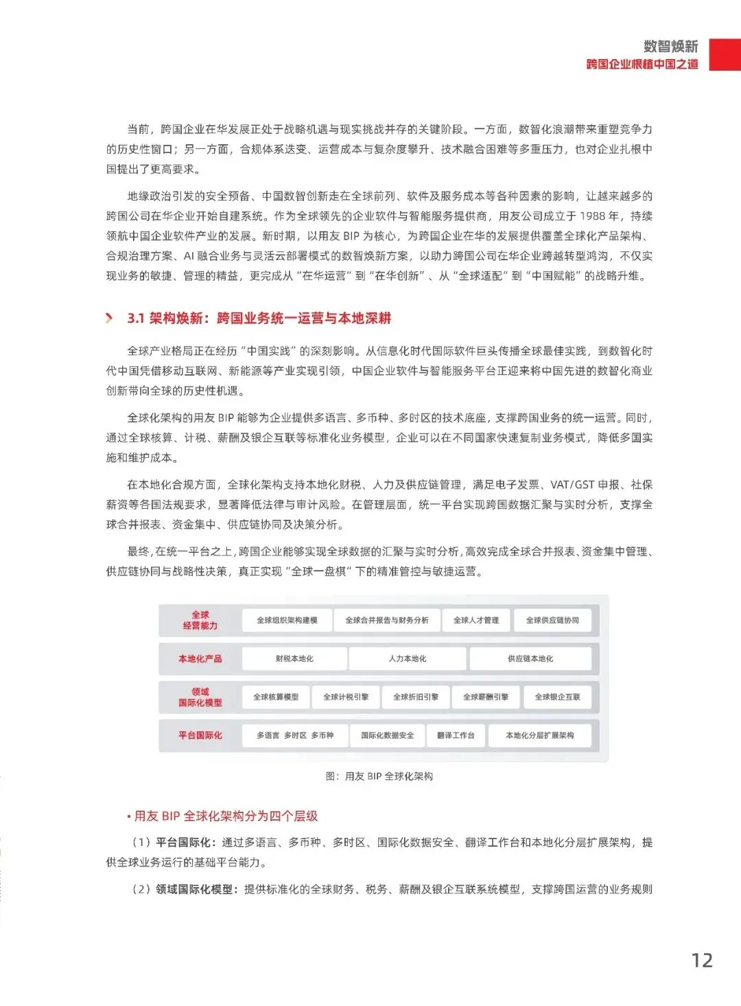 用友BIP作为数智化底座,提供全球化产品架构、合规治理方案及AI融合业务支持,助力跨国企业在华实现业务敏捷、精益管理及全球运营。未来,跨国企业需将中国创新转化为全球竞争力,实现与中国经济共生共荣。