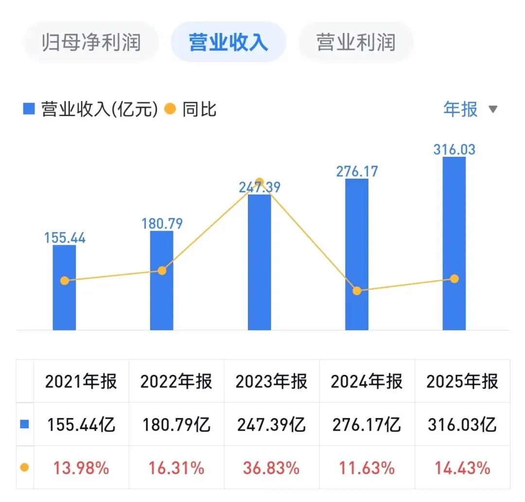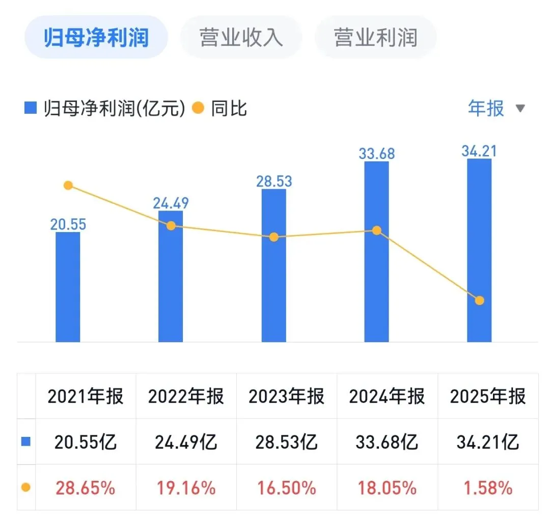 2025年,华润三九实现营业收入316.0亿元,同比增长14.4%。增长的驱动力主要来自受益于天士力并表处方药业务爆发。尽管营收增长迅速,但公司归母净利润34.2亿元,同比仅增长1.6%。扣非净利润增速更是低至0.5%。