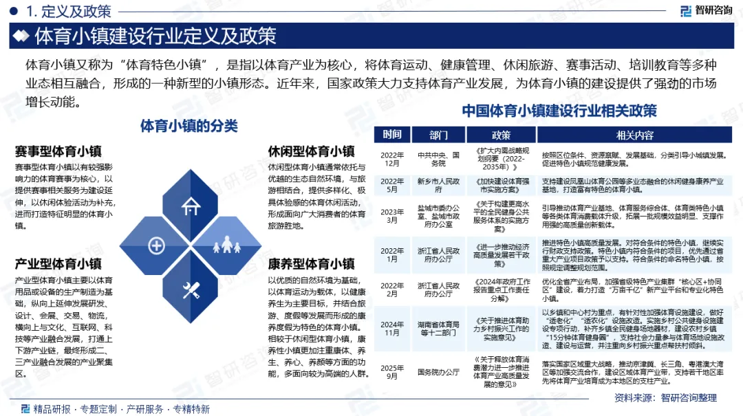 相关概述:体育小镇又称为“体育特色小镇”,是指以体育产业为核心,将体育运动、健康管理、休闲旅游、赛事活动、培训教育等多种业态相互融合,形成的一种新型的小镇形态。体育小镇通常具有完善的体育设施、丰富的体育文化、优美的自然环境和独特的人文景观,能够满足人们对体育运动、健康管理、休闲旅游等多方面的需求。根据体育小镇目标受众与细分产业类型的不同,大致将其分为赛事型体育小镇、休闲型体育小镇、产业型体育小镇、康养型体育小镇四类。