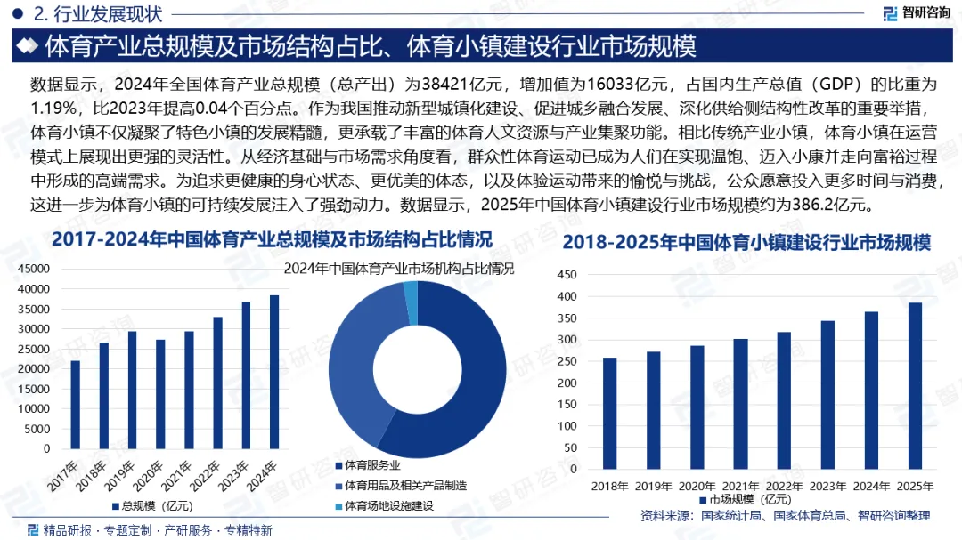 体育产业总规模:随着我国经济社会的快速发展和人民生活水平的不断提高,体育产业作为现代服务业的重要组成部分,正迎来前所未有的发展机遇。近年来,国家高度重视体育产业发展,出台了一系列政策措施,鼓励和支持体育产业创新,推动体育产业与旅游、文化、康养等产业融合发展。数据显示,2024年全国体育产业总规模(总产出)为38421亿元,增加值为16033亿元,占国内生产总值(GDP)的比重为1.19%,比2023年提高0.04个百分点。从内部构成看,2024年体育服务业增加值为11548亿元,占体育产业增加值的比重为72.0%,比2023年下降0.7个百分点。体育用品及相关产品制造增加值为4245亿元,占体育产业增加值的比重为26.5%,比2023年提高0.8个百分点。体育场地设施建设增加值为240亿元,占体育产业增加值的比重为1.5%,比2023年下降0.1个百分点。在此背景下,体育小镇作为一种新兴的体育产业集聚区,凭借其独特的产业定位、完善的基础设施和丰富的体育资源,迅速成为各地政府推动体育产业高质量发展的重要抓手。