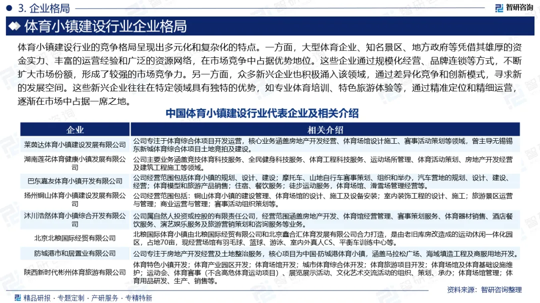 企业格局:体育小镇建设行业的竞争格局呈现出多元化和复杂化的特点。一方面,大型体育企业、知名景区、地方政府等凭借其雄厚的资金实力、丰富的运营经验和广泛的资源网络,在市场竞争中占据优势地位。这些企业通过规模化经营、品牌连锁等方式,不断扩大市场份额,形成了较强的市场竞争力。另一方面,众多新兴企业也积极涌入该领域,通过差异化竞争和创新模式,寻求新的发展空间。这些新兴企业往往在特定领域具有独特的优势,如专业体育培训、特色旅游体验等,通过精准定位和精细运营,逐渐在市场中占据一席之地。当前,中国体育小镇建设行业代表企业包括莱茵达体育小镇建设发展有限公司、湖南莲花体育健康小镇发展有限公司、巴东嘉友体育小镇开发有限公司、扬州铜山体育小镇建设发展有限公司、沐川浩然体育小镇综合开发有限公司、北京北粮国际经贸有限公司、防城港市和居置业有限公司、陕西新时代彬州体育旅游有限公司等。