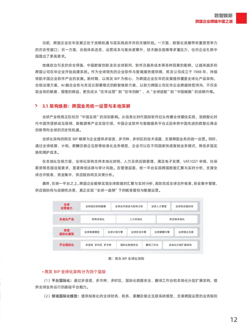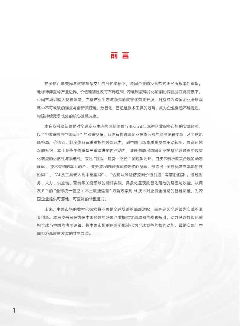 《跨国企业在华经营数智化实践白皮书》由用友与德勤联合发布,立足全球重构与中国跃迁双重视角,剖析了跨国企业在华数智化转型的必然性、挑战与落地路径,为其扎根中国市场提供了系统性指引。