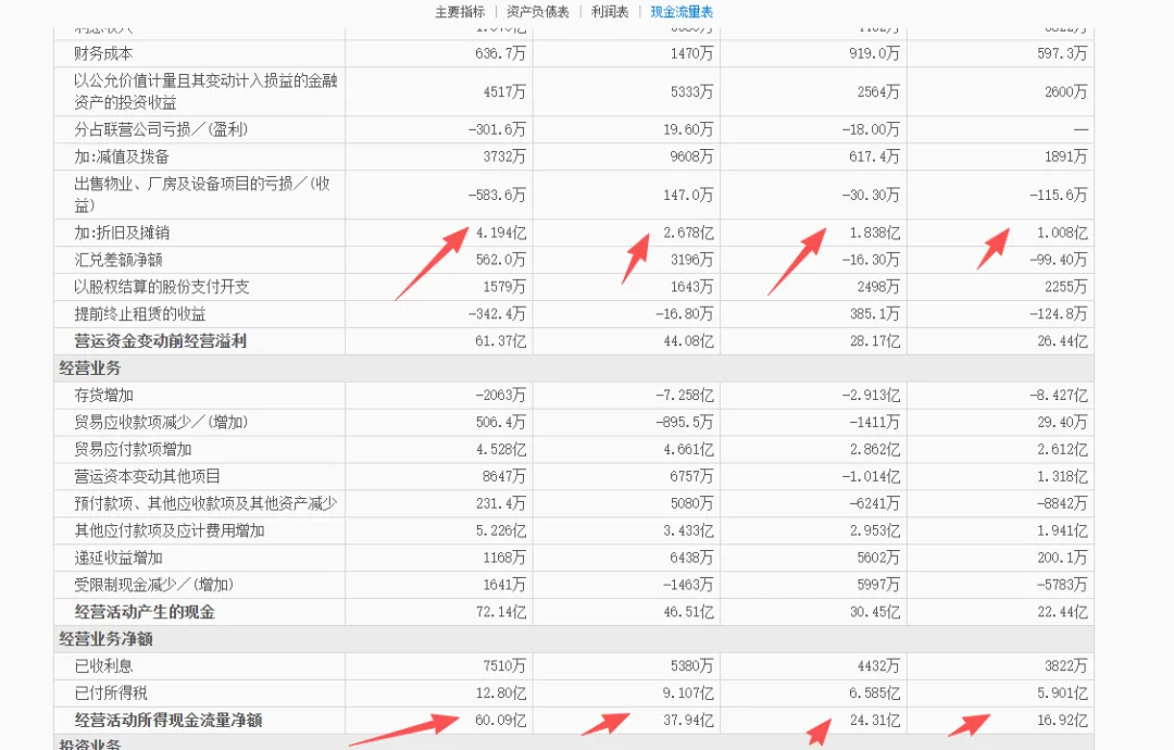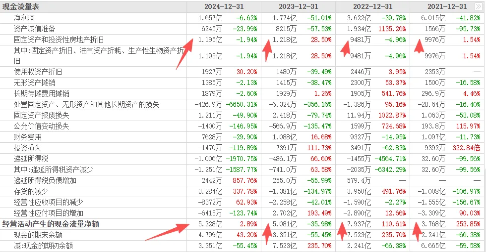 我们在准备买入一家公司股票的时候,肯定是要先看下这家公司的财务报表的各项指标,是否比同行业的更优秀,他的资产有多少,现金有多少,负债多少这些.咱们看现金流量表,主要看什么.里面有个比较重要的数据,就是"经营活动现金流量净额".这个金额反映的企业卖出去的产品,收到了多少现金.很好理解,假如是你经营的公司,今年一年卖出去了1万的货,结果都是欠款,没有现金收回来.到年底一算账,外面欠了你1.5万元的货款.利润表上显示还赚了5千元,但是现金流量净额这里去是0.你想一下,你公司的日子能好过吗?买股票就是买公司,所以我们在投资股票的时候,也要重点看企业的现金流量净额是否大于0,大多少.来确定这家公司是否是个好公司.如果这个净额小于0,说明这家公司入不敷出,需要靠借钱过日子.如果这个净额等于0,说明这家公司的现金流勉强能维持当前的经营,但是别忘了企业在经营中,设备,厂房之类的都会的折旧.过几年设备旧了,他们是没钱更换的.他们在市场上是没有竞争力的企业.如果净额大于0,费用还刚好可以覆盖住企业的折旧摊销那些费用,但这种企业后期是没办法扩大生产的,因为没有净利润让他们再去投资.想扩大规模,只能再向市场借钱.风险比较高.如果净额,大于0,且结余的费用远远大于折旧需要的费用,说明这家企业,现金流正常,能覆盖当时设备折旧,并且后期也有能力更换新设备,扩大生产规模.这种企业才是我们需要长期关注的好公司.这个净额大于折旧的越多,越说明企业的潜在成长性越好.为了给大家更直观的可以看明白,我给大家随意在上市公司上面,找了2家公司的现金流量净额作对比,大家就可以看出来了.2024年,折旧费用1.195亿,经营活动产生的现金流量净额5.229亿,折旧费用占到了22%2023年,折旧费用1.218亿,经营活动产生的现金流量净额5.081亿,折旧费用占到了24%2022年,折旧费用0.9327亿,经营活动产生的现金流量净额7.937亿,折旧费用占到了12%2022年,折旧费用0.9976亿,经营活动产生的现金流量净额3.788亿,折旧费用占到了26%2024年,折旧费用4.194亿,经营活动产生的现金流量净额60.09亿,折旧费用占到了8%2023年,折旧费用2.678亿,经营活动产生的现金流量净额37.94亿,折旧费用占到了7%2022年,折旧费用1.838亿,经营活动产生的现金流量净额24.31亿,折旧费用占到了8%2022年,折旧费用1.008亿,经营活动产生的现金流量净额16.92亿,折旧费用占到了6%这样是不是就可以比较直观的看出来,哪家企业的竞争优势更明显一些?企业的财报有很多数据,都需要一一对比,不是说只有这一个好,就是好公司了,但这点对于我们判断企业是否值得投资来说,是很重要的一个参考标准.