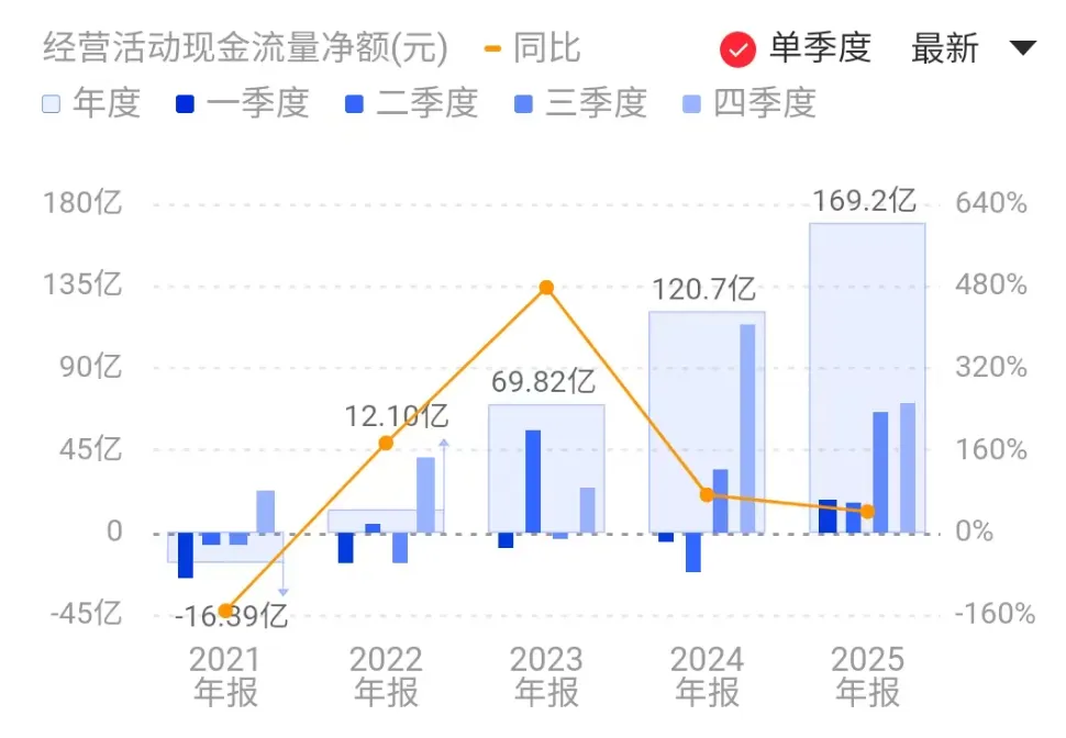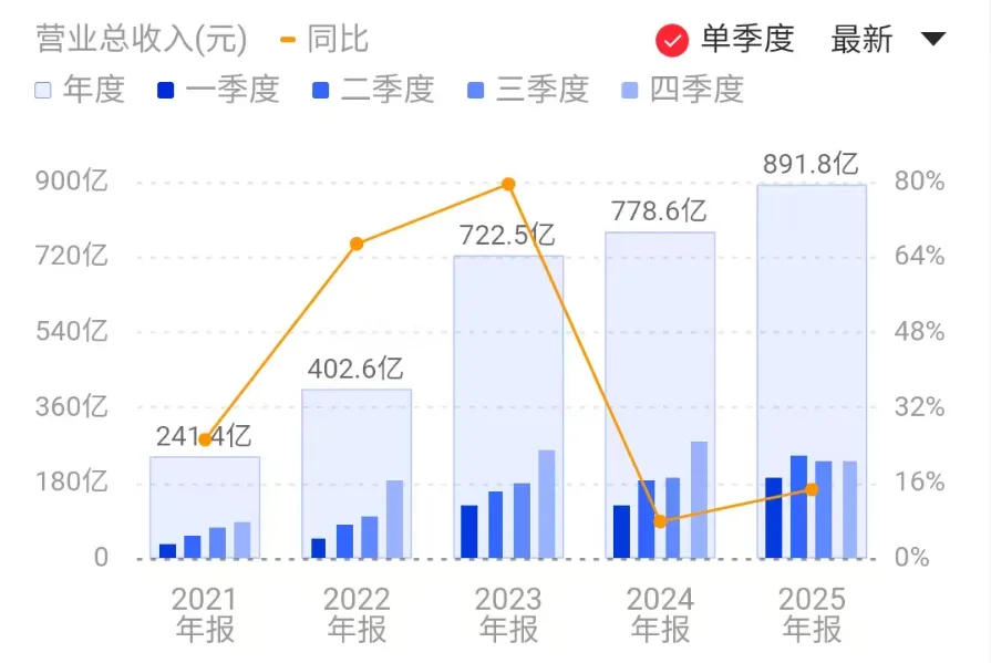 首先看营收数据,2025年营收891亿,同比增长14.55%,似乎看着还行啊。但再看下2025年前三季度的营收664亿,同比增长32.95%。这就是说,四季度的营收同比不仅没增长,反而是大幅下滑的(下滑了18%+),以上的柱状图对比也是能看出来的。