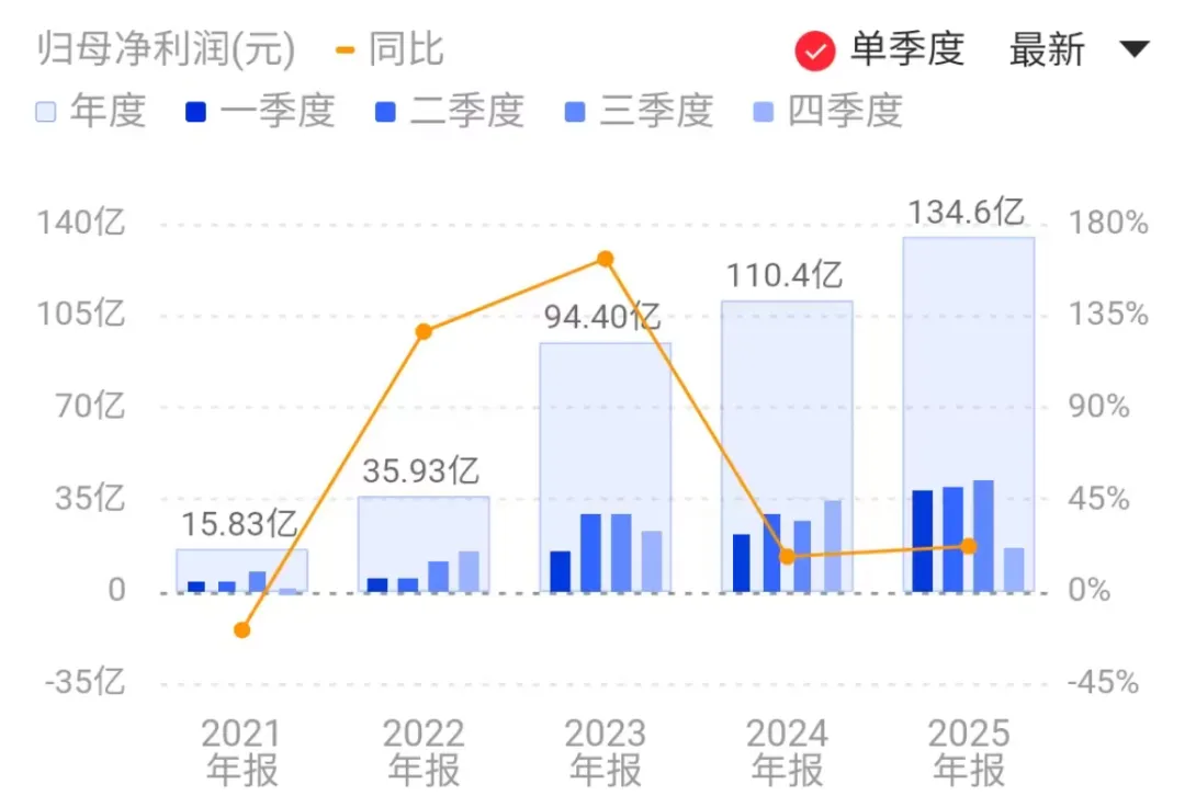 接下来看净利润数据,这张图就能看出点端倪了:四季度利润大降,远不及预期,市场就砸给你看。2025年前三季度,净利润同比增长56.34%,全年就只剩21.97%。