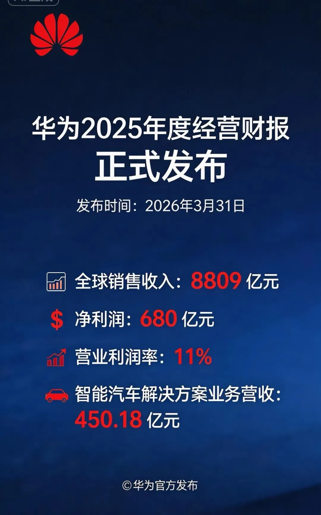 根据华为公开年报,2025年华为实现销售收入8809.41亿元,同比增长 2.2%;净利润 680.36亿元,同比增长 8.7%。