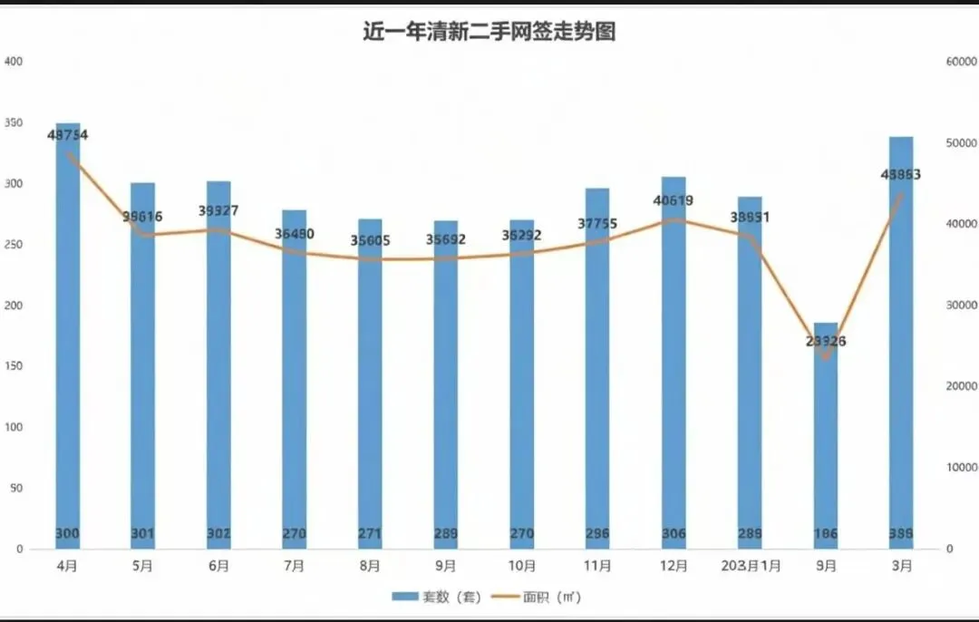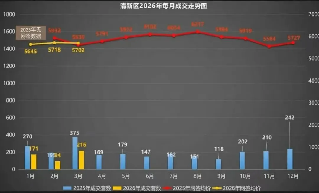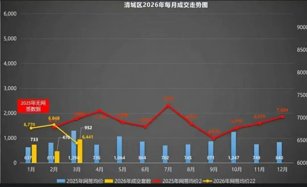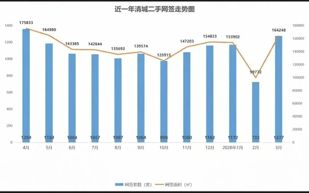 2026年3月清城区二手住宅网签量:1277套,环比涨77%;网签面积:164248㎡,环比涨65%。2026年3月清新区二手住宅网签套数:339套,环比涨82%;网签面积为:42863㎡,环比涨88%。2026年3月清城区商品住宅单月成交量为:952套,环比上月涨103%,同比2025年3月跌27%;2026年3月清城区商品住宅网签均价为:6441元/㎡,环比上月跌6%,同比2025年3月跌8%。2026年3月清新区商品住宅单月成交量为:216套,环比上月涨130%,同比2025年3月涨1%;2026年3月清新区商品住宅网签均价为:5702元/㎡,环比上月跌0.3%,同比2025年3月跌42%。*备注:数据来源于清远市商品房管理信息平台,仅供参考。更多楼市资讯,立即关注@广房找房