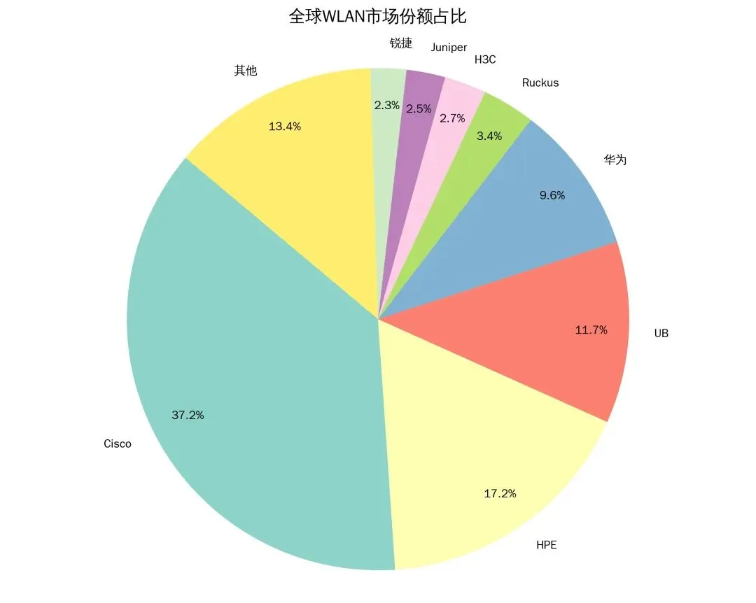 3)全球WLAN市场,Cisco占比37.2%,HPE占17.2%,UB占比11.7%比24年增长53%,华为第四占9.6%,Juniper下滑超过45%占比仅有2.5%。