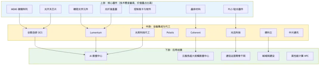 上游核心器件:MEMS 微镜、光芯片、精密光学元件及晶体材料,技术壁垒高、验证周期长 中游整机/代工:直接对接头部客户,受益放量弹性大 技术趋势:CPO、硅光等下一代技术布局