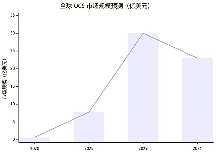 全球 OCS 市场规模从 2020 年的0.7 亿美元增长至 2025 年的7.8 亿美元,年复合增长率达62% 预计到 2029 年市场规模将突破25-30 亿美元,2026-2029 年复合年增长率高达58% 2031-2032 年市场规模有望达到20-23 亿美元 全球 OCS 交换机出货量预计 2027/2028/2029 年分别达到5 万/20 万/30 万台,呈现爆发式增长态势