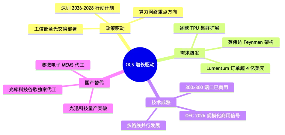 政策驱动:工信部将全光交换纳入算力网络重点方向,深圳等地出台专项规划 需求爆发:谷歌、英伟达等科技巨头加速部署,Lumentum OCS 积压订单超4 亿美元 技术成熟:OFC 2026 传达明确信号,OCS 正向"必选项"演进 国产替代:国内厂商在整机及核心器件领域取得突破,实现量产与批量供货