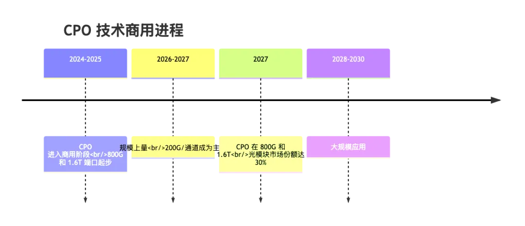技术本质:将光学组件直接集成到交换机的 ASIC 封装中 优势:缩短信号传输距离,提高信号传输质量,实现更高的连接能力,降低功耗 商用进程: 2024-2025 年:进入商用阶段(800G 和 1.6T 端口) 2026-2027 年:实现规模上量,200G/通道成为主流 2027 年:CPO 技术在 800G 和 1.6T 光模块中的市场份额有望达到 30% 2028-2030 年:大规模应用