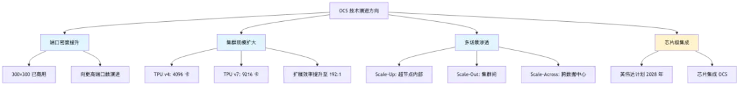 端口密度提升:当前谷歌部署的 OCS 已达到 300×300 端口,并向更高端口数演进 集群规模扩大:TPU v4 集群 4096 卡 → TPU v7 集群 9216 卡 多场景渗透:适配 Scale-Up、Scale-Out、Scale-Across 三大算力集群场景 芯片级集成:英伟达计划 2028 年实现芯片集成 OCS
