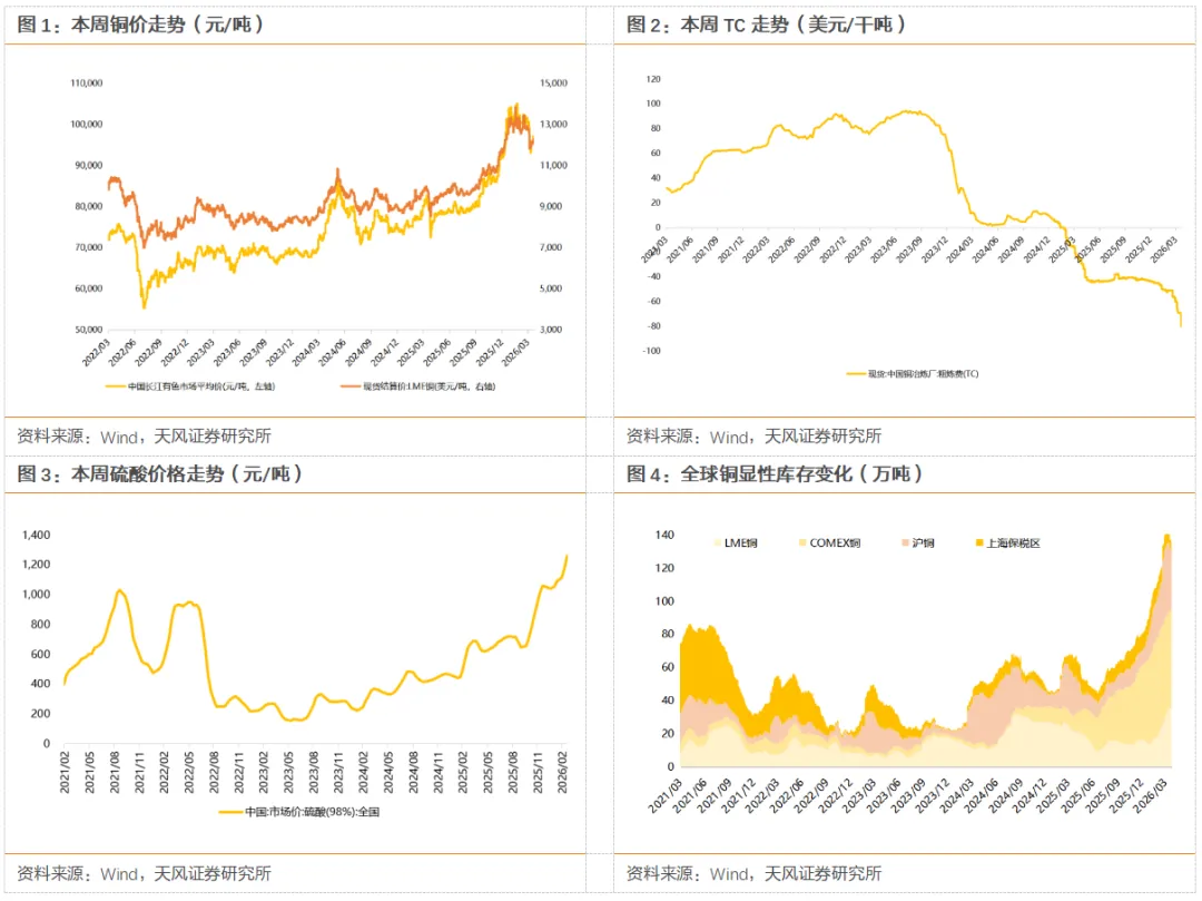 1)铜:本周(2026.3.30-2026.4.3)铜价重心继续回升,沪铜收于96250元/吨。由于周内抵港到船货源到货,进口铜流入表现增加,但临近清明小长假,下游企业逢低备货情绪仍存,社库去库幅度有所放缓。同时进入月初,部分持货商低价贴水出货情绪有限,加之国产货源到货较少,现货贴水幅度亦有所收敛。节后来看,短期铜价低位震荡,下游企业采购需求表现尚可,且冶炼厂发货仍有限,加之临近交割换月,持货商低价贴水出货情绪较弱,现货升贴水预计企稳回升为主。相关标的:紫金矿业、五矿资源、洛阳钼业、金诚信、西部矿业、中国有色矿业、铜陵有色、江西铜业。