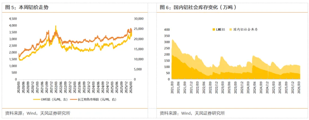 2)铝:本周(2026.3.27-2026.4.2)铝价连涨后持稳趋势,整体均价上涨,沪铝收于24660元/吨,市场担忧中东供给绕道下全球铝供应缺口或将扩大。供应方面:本周电解铝行业生产端继续保持小幅增加趋势,整体暂无减产、复产出现;新投产方面依旧是内蒙古某企业新产能继续投产。需求方面:本周铝板带箔、铝棒产量较上周增加。成本氧化铝方面,中国国产氧化铝价格走势转稳,预焙阳极方面,预焙阳极采购价格上涨。电价方面,下游需求放缓,动力煤市场价格涨跌互现;按照电价周期计算,火电电价继续上涨。水电方面,枯水期水电电价高位维稳。综合来说,预计本周电解铝理论成本继续增加。利润方面:受原材料价格上涨影响,预计本周电解铝理论成本继续增加。现货铝均价大幅上涨。综合来看,预计本周电解铝理论利润较上周增加。库存方面:本周LME铝库存较上周减少,中国方面,本周铝锭社会库存持续累库趋势。相关标的:神火股份、华通线缆、天山铝业、南山铝业、中国宏桥、创新实业、云铝股份、中孚实业、宏桥控股、百通能源、中国铝业(A+H)、焦作万方等。