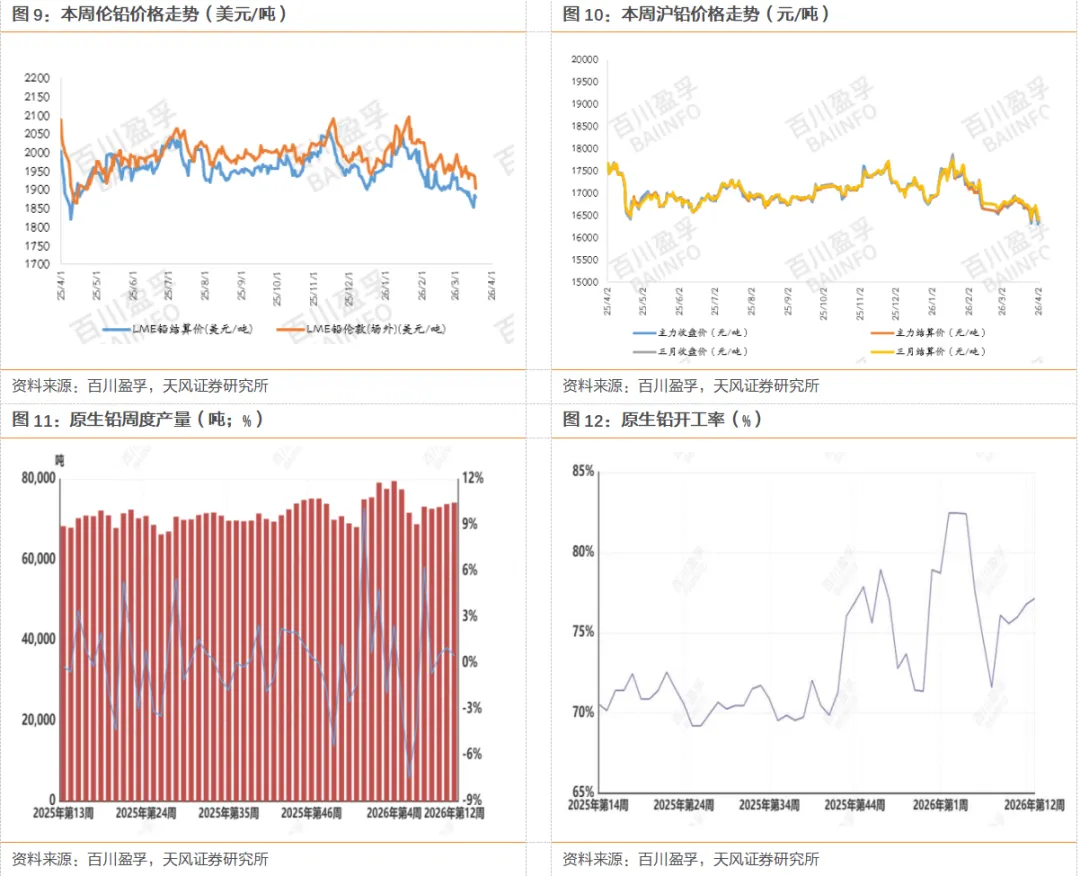综述:本周现货铅锭交易指导价运行在16325-16525元/吨,周平均16405元/吨,较上周上涨115元/吨,涨幅0.71%。伦铅运行于1888—1915美元/吨,沪铅主力合约运行在16400-16775元/吨,较上周均为上涨走势。4月再生铅大厂检修预期下,市场对精铅供给存紧张预期,叠加美国周初释放可能快速了解伊朗战争的言论,市场情绪转为偏好风险商品,基本金属均有抬涨,铅价再受情绪驱动快速上涨。