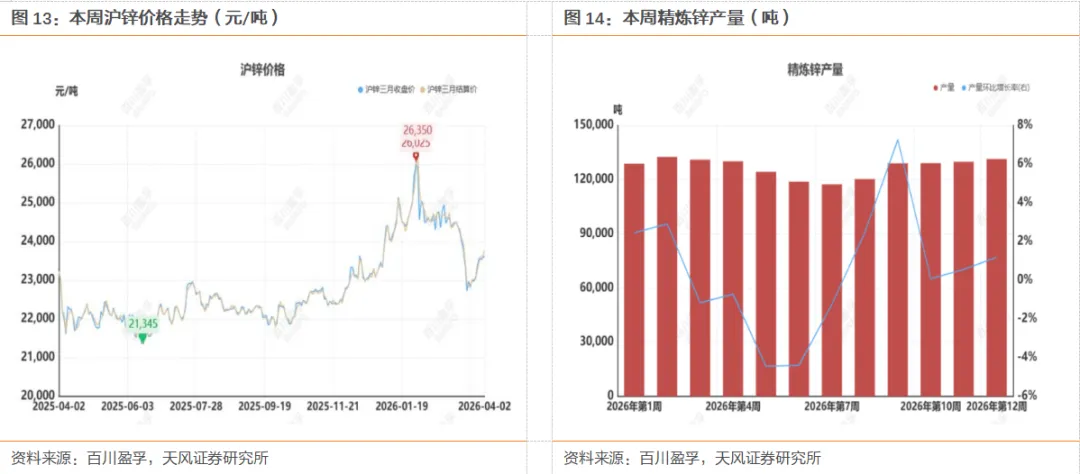后市预测:百川盈预估预估下周沪锌主力运行区间在23000-24000元/吨,伦锌运行区间在3100-3300美元/吨。整体来看,宏观风险扰动反复,矿端成本提供支撑,但需求缺乏强增量,社库去库持续性不足节奏反复,锌价上方空间受到制约,下周或延续震荡格局。