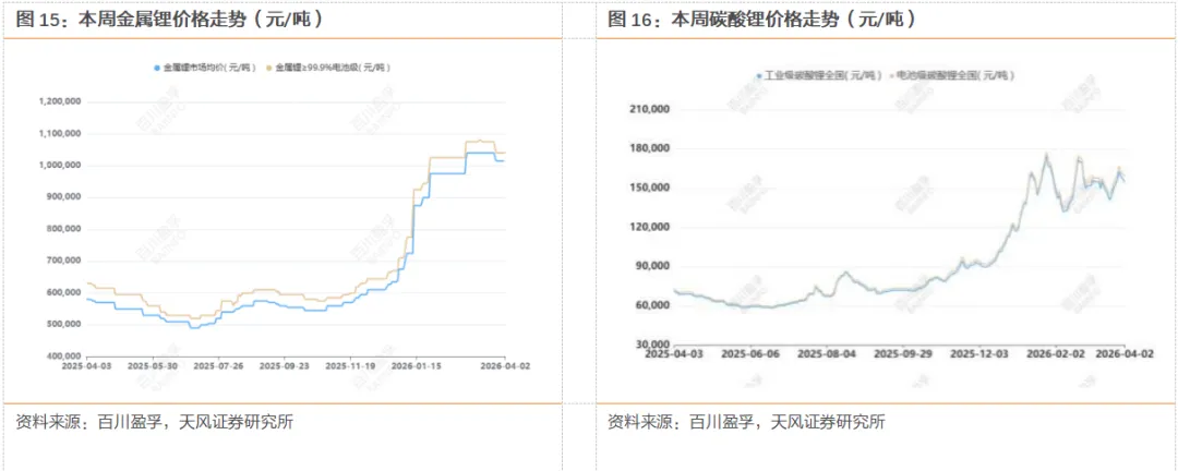 市场综述:本周(2026.3.27-2026.4.2)碳酸锂价格小幅上涨,整体成交氛围较为清淡。截至4月2日,国内工业级碳酸锂(99.0%为主)市场成交价格区间在15.2-15.8万元/吨,市场均价为15.5万元/吨,较上周价格上涨1.31%;国内电池级碳酸锂(99.5%)市场成交价格区间在15.6-16.2万元/吨,市场均价15.9万元/吨,较上周价格上涨1.27%。本周碳酸锂期货价格呈现先涨后跌走势,周初受期货盘面走强带动,现货价格连续上行。后半周受期货震荡下行拖累,现货价格逐步回调。期现基差整体窄幅波动,电碳贴水区间集中在200-2400元/吨,工碳及准电贴水区间集中在1000-4500元/吨。锂盐厂散单出货节奏随盘面价格调整,贸易商随行就市灵活报价。下游材料厂延续刚需采购,叠加现货货源供给充足,采购端备货积极性偏弱,整体成交氛围偏淡。