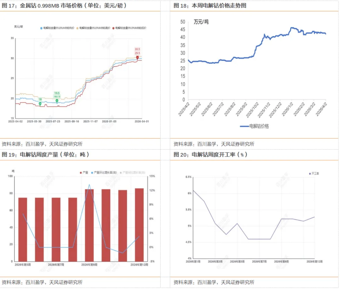 电解钴综述:本周(2026.3.27-2026.4.2)国内电解钴价格重心下移。截至目前,百川盈孚统计99.8%电解钴价格在41.7-42.8万元/吨,均价为42.25万元/吨,较上周同期下跌0.6万元/吨,跌幅1.40%。本周MB钴价小幅上涨,国内电子盘弱势下行。本周市场呈现“高成本、弱需求”的核心矛盾格局。尽管原料端价格高企,但受终端消费疲软影响,成本向下游传导明显不畅,导致冶炼环节利润空间受到持续挤压。上游在成本倒挂下坚持挺价,现货流通偏紧;但下游合金及磁材企业多持观望态度,仅维持刚需、小单补库,市场整体交投气氛清淡,实际成交有限。