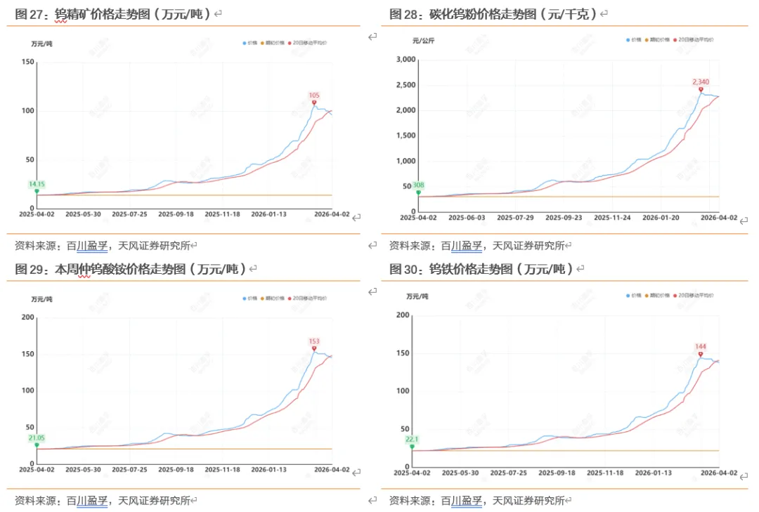 综述:本周(2026.3.27-2026.4.2)钨价下调。截止到本周四,65度黑钨精矿均价在96.3万元/吨,较上周下调4万元/吨,仲钨酸铵在146万元/吨,较上周下调3万元/吨,70钨铁均价在135.5万元/吨,较上周下调2万元/吨,碳化钨粉在2280元/千克,较上周下调20元/千克。钨市场多空博弈情绪浓厚。上游原生矿端挺价意愿尚存,持货商库存低位,惜售心态未改;下游采购则延续刚需模式,高价承接力有限,买卖双方观望氛围升温。中游冶炼与加工环节报价随原料端小幅波动,实单成交偏淡,市场交投活跃度不及前期。本周行情向下窄幅震荡、成交缩量特征,暂未出现方向性突破。