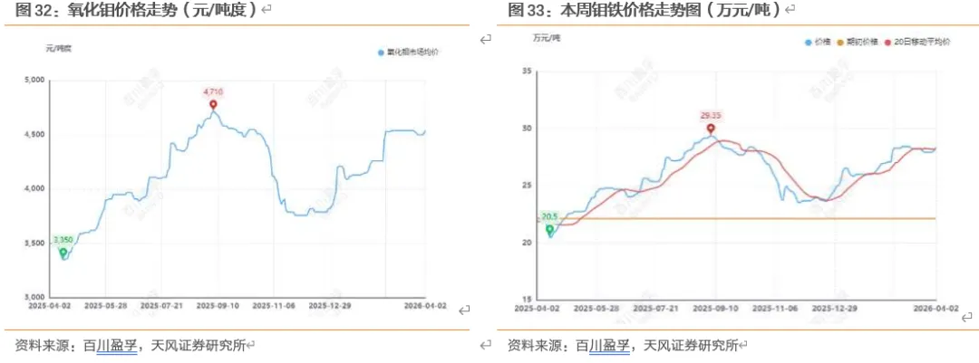 综述:本周(2026.03.27-2026.04.02)成本高位支撑,业者挺价意愿强烈。截至4月2日,中国45-50度钼精矿今日均价为4435元/吨度,较上周四均价上调0.91%;氧化钼今日均价为4540元/吨度,较上周四均价上调0.89%;钼铁今日均价为28.4万元/基吨,较上周四均价上调1.61%;一级四钼酸铵今日均价为27.75万元/吨,较上周四均价上调0.36%;一级钼粉今日均价为52.5万元/吨,较上周四均价持平。