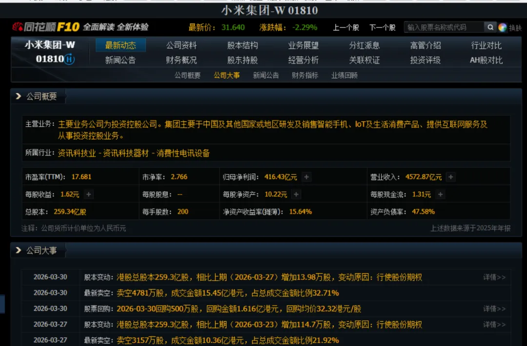 近期,小米披露的2025年年报显示,公司全年营业收入达4572.87亿元,归母净利润416.43亿元,经营活动现金流净额341.42亿元,各项核心指标均实现稳步增长,财报表现亮眼。但与之形成反差的是,小米股价近期持续承压,截至2026年3月31日,股价报31.62港元,近三个月累计下跌21.5%,让不少投资者陷入“业绩好为何股价不涨”的困惑。