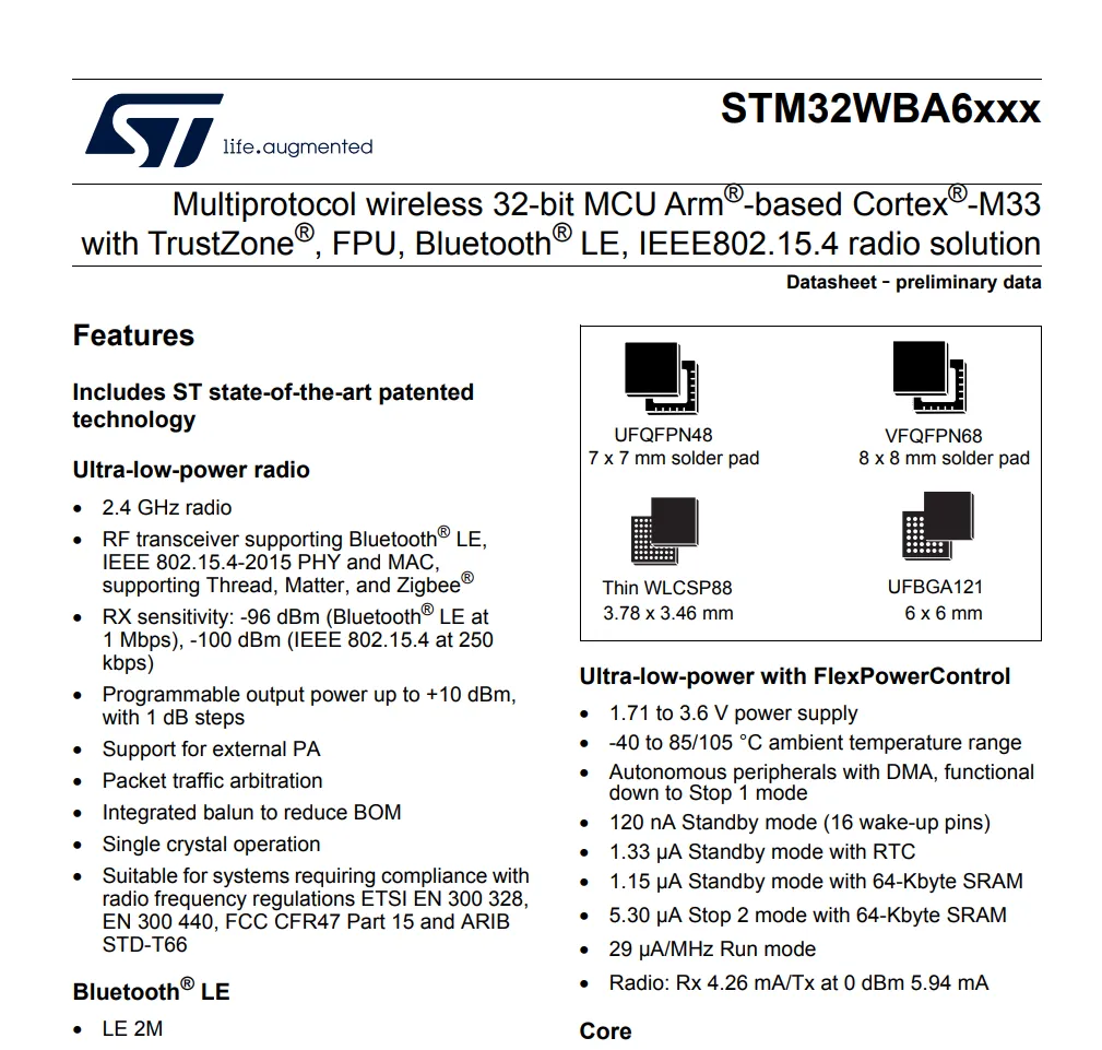 首先是STM32WBA63CI?,这款高性能32位微控制器,搭载 Arm Cortex-M33 32 位 RISC 内核,还内置一款性能强大且超低功耗2.4Ghz无线电模块。