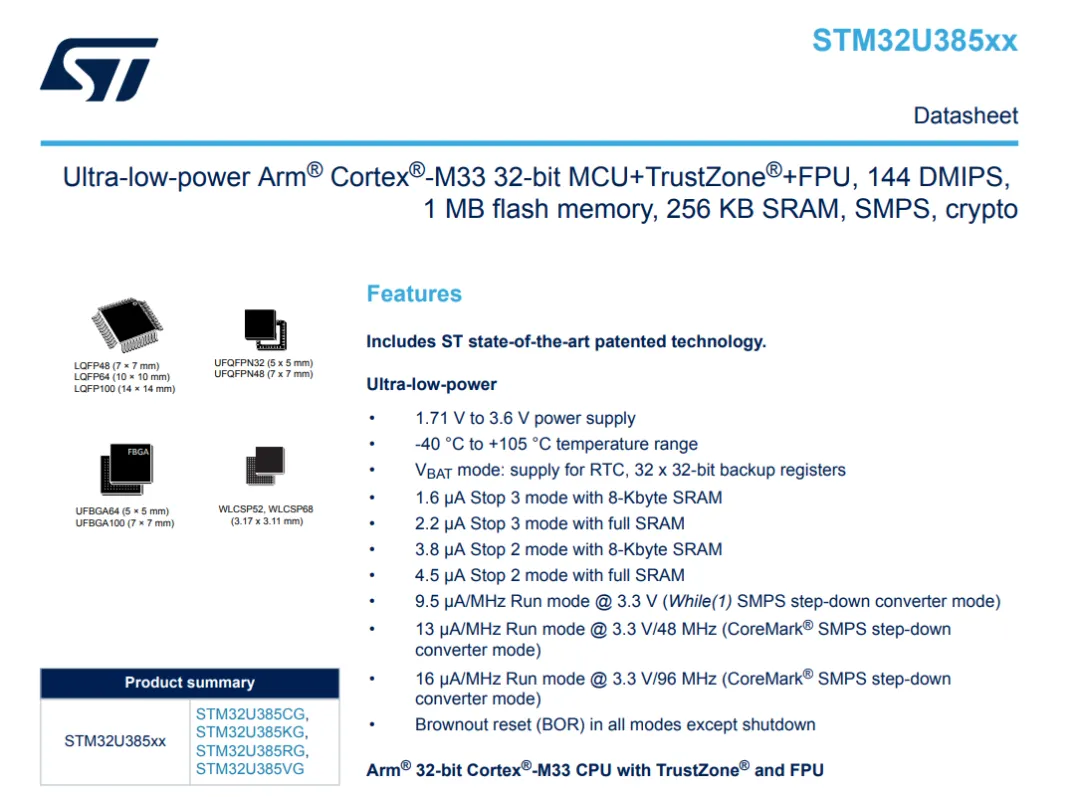 最后是STM32U385VG?,是一款基于高性能 Arm Cortex-M33 32 位 RISC 内核的超低功耗微控制器,专为智能手表、医疗设备、工业传感器等对续航和安全性要求极高的场景设计。