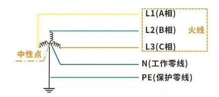 上图为电源处的接线方式,中心点出的N线(零线)是接地的,这也是为什么任意相线可以和大地构成回路的一个重要原因!而在进户线处除了三相制三根相线到户以外,还会到一根零线,那么三相五线制的地线哪里去了?地线不从电源处引入,一般由大楼的接地提供!