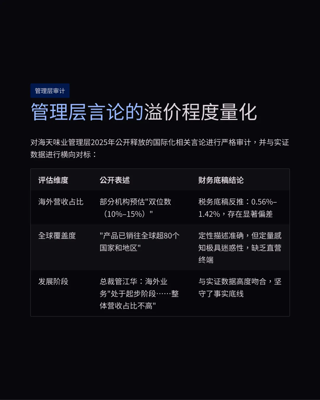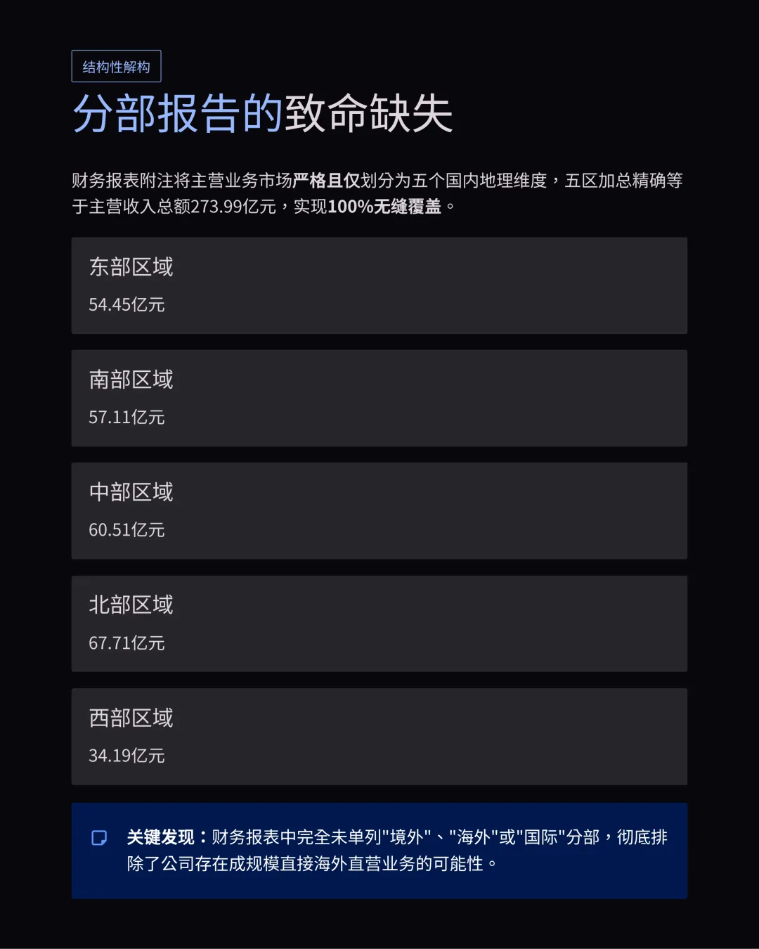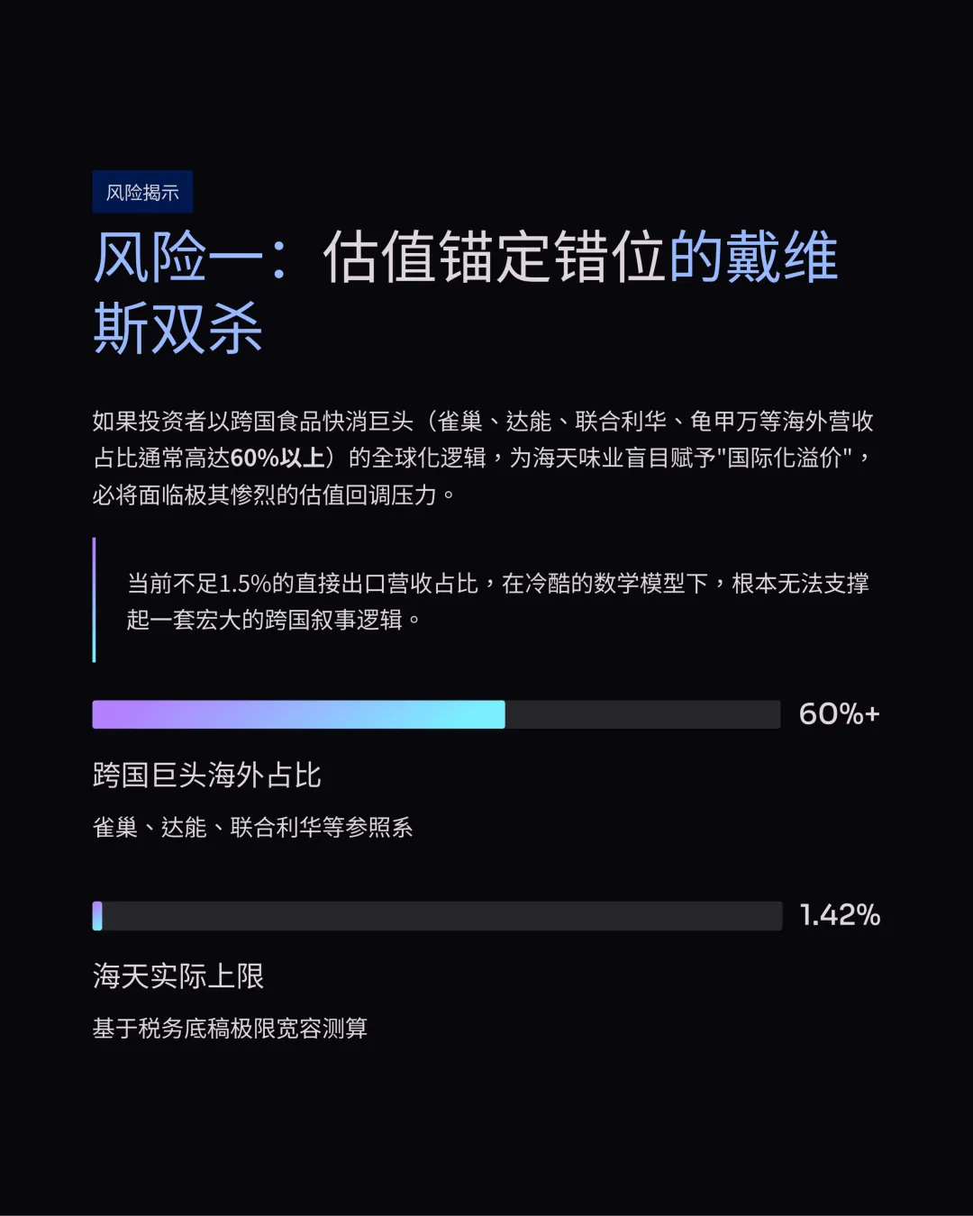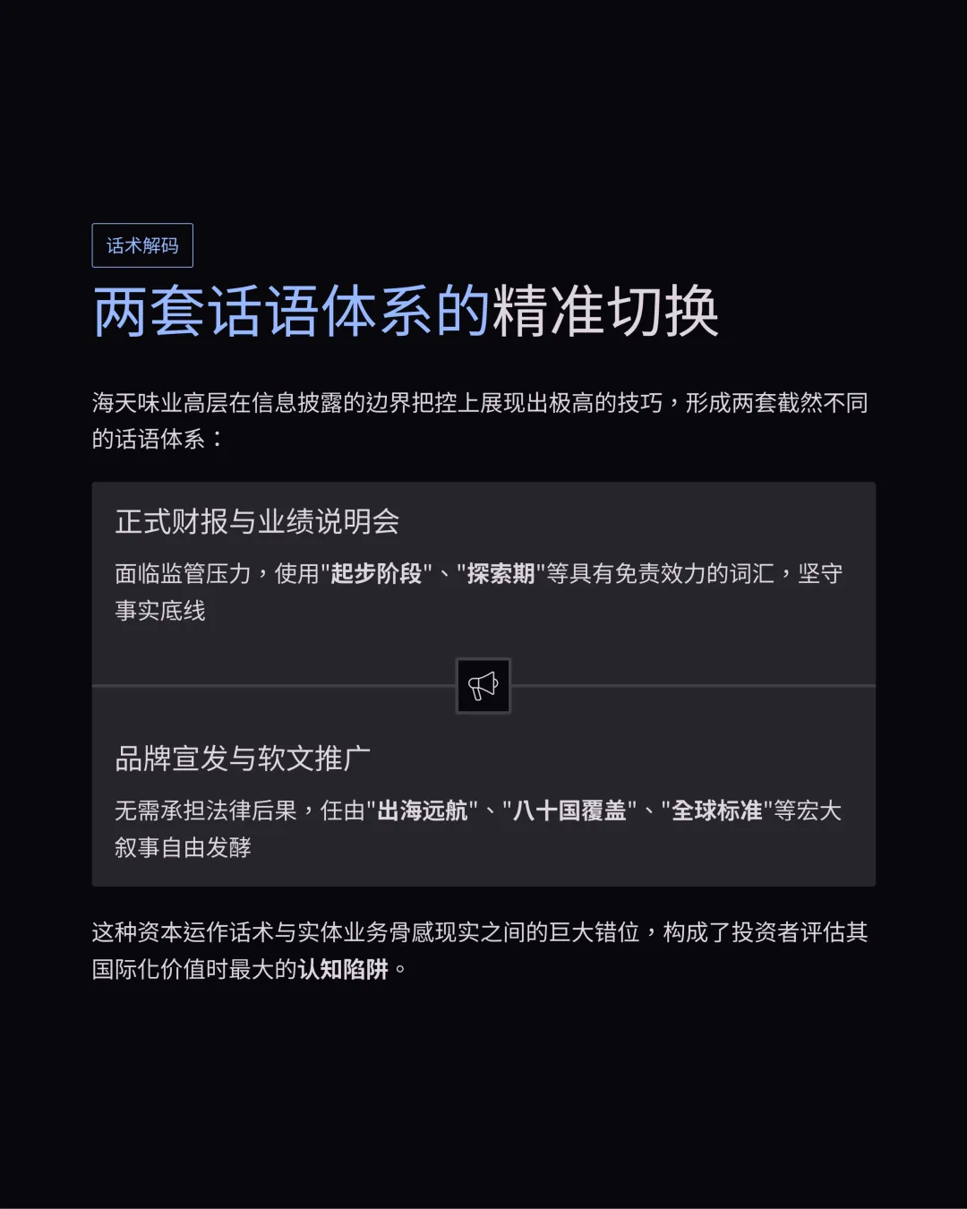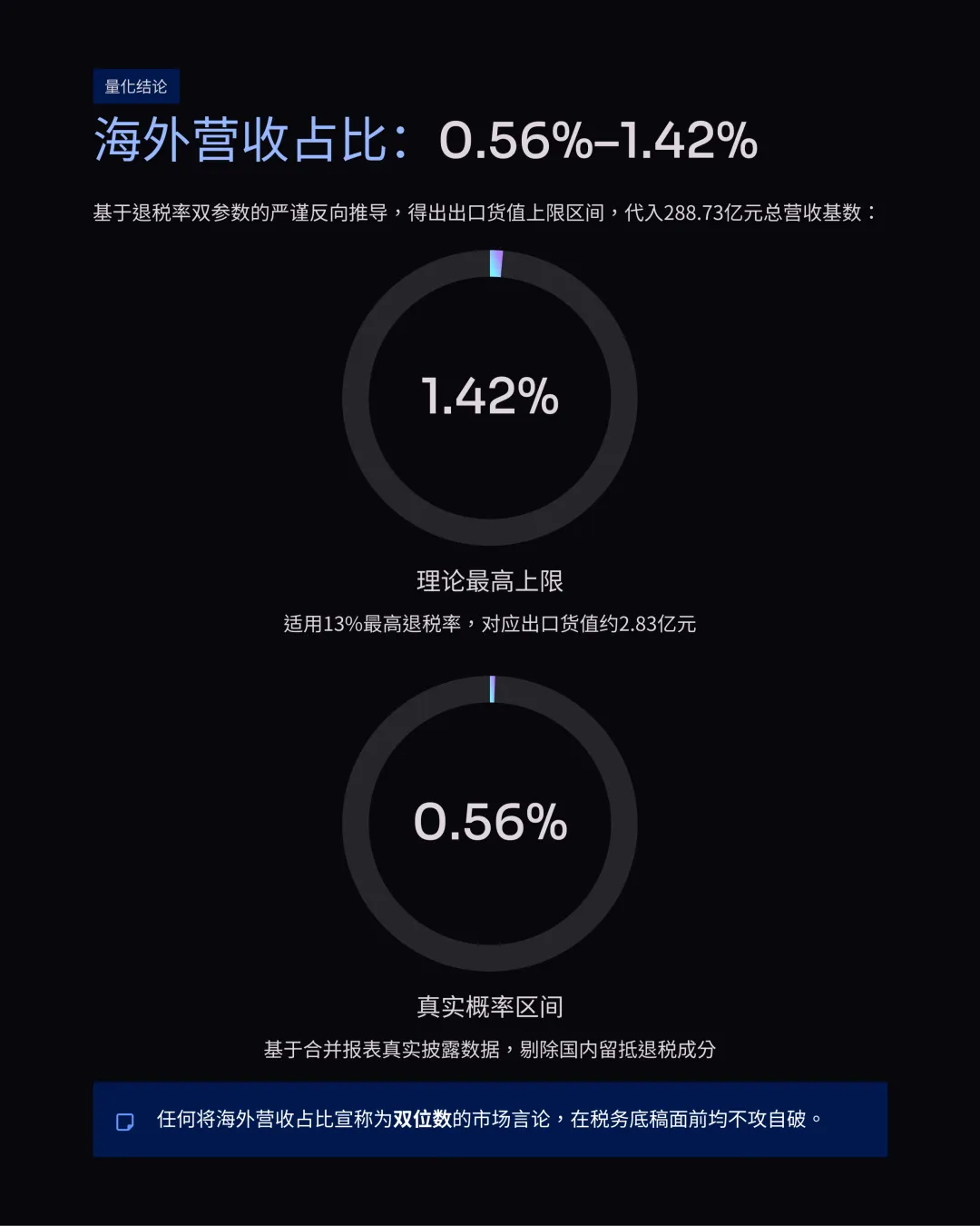 面对监管的正式财报说明会客观指出海外业务仅处于起步阶段,但公关宣传中关于产品覆盖全球80余个国家的表述极易使投资者产生双位数海外营收占比的错觉,从而引发严重的估值锚定偏离与戴维斯双杀风险。