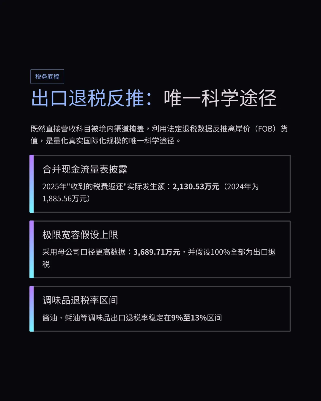 结合2130.53万元至3689.71万元的退税数据与最高13%的退税率推演,公司销往海外的调味品主要依赖境内确收贸易,其实际海外直接营收占比被明确锁定在0.56%至1.42%的极低区间内。