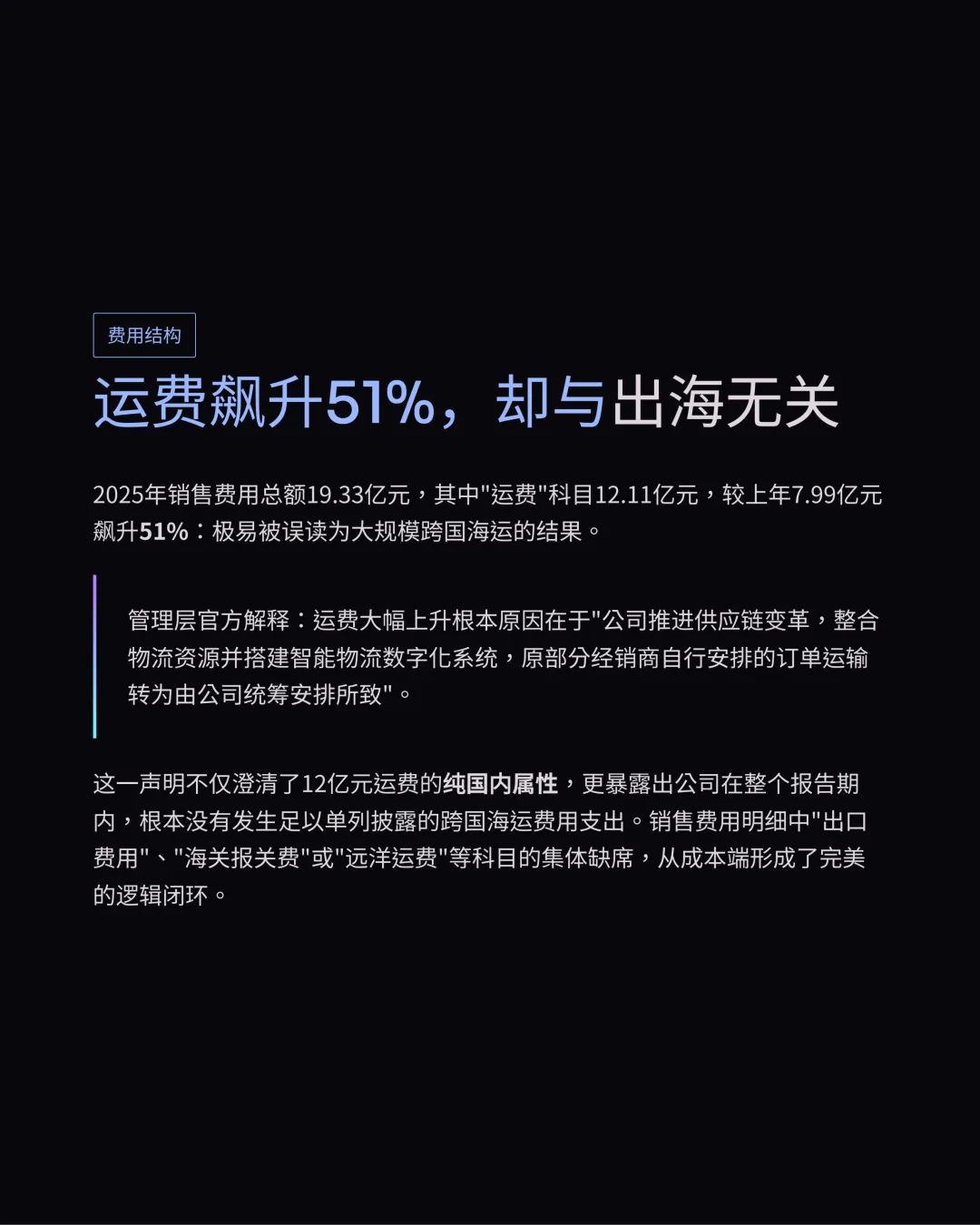 尽管2025年销售费用中的运费发生额同比激增51%至12.11亿元,但官方已澄清此项纯属国内物流变革引发的重组费用,而与主动国际贸易直接相关的跨国海运及目的国清关等专项开支在财务明细中完全缺席。